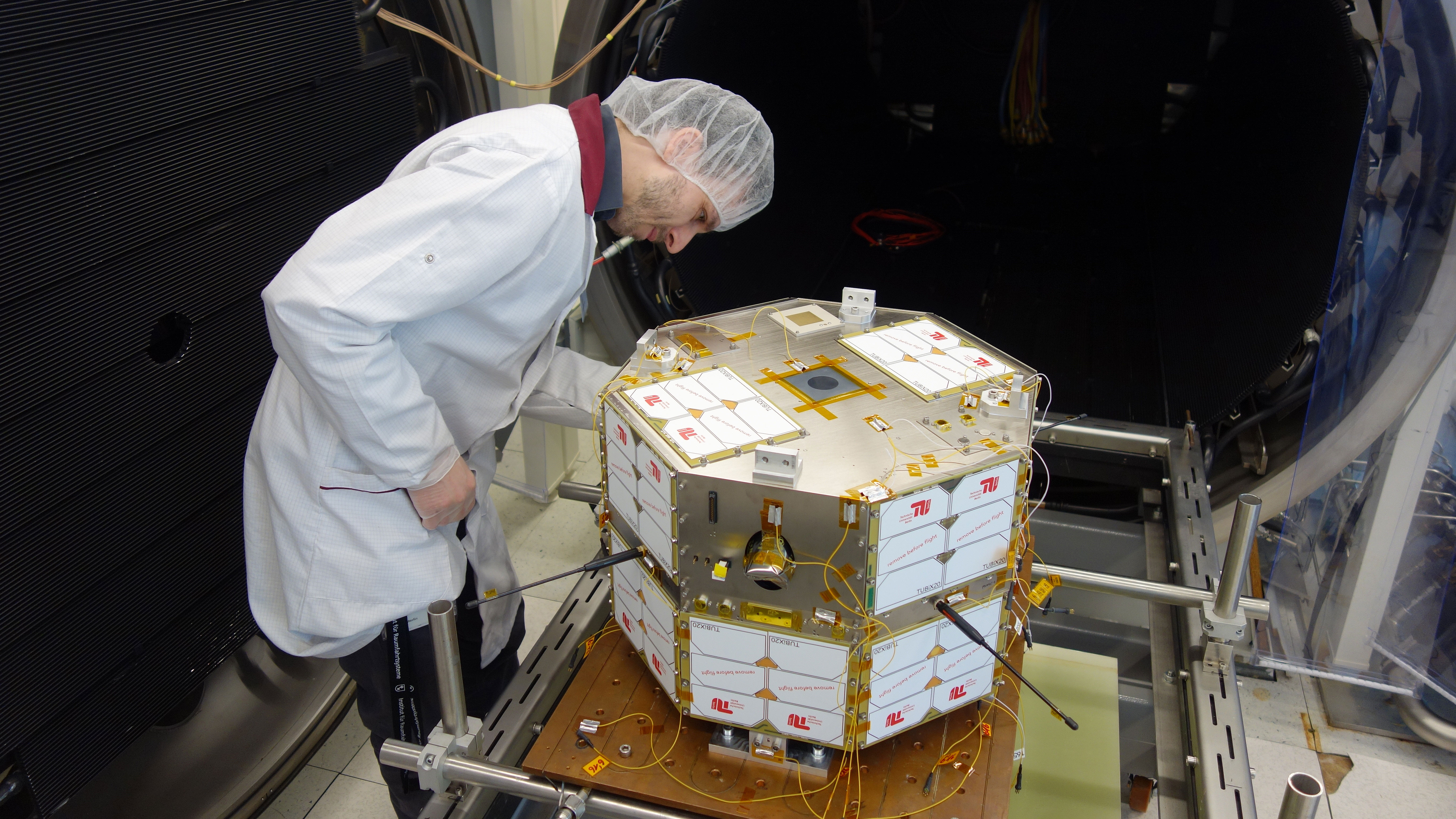 Bevor der Satellit in den Weltraum starten kann, muss TechnoSat einen Thermal-Vakuum-Test, das heißt einen Test bei hoher und tiefer Temperatur im Vakuum beim Deutschen Zentrum für Luft- und Raumfahrt in Berlin durchlaufen.