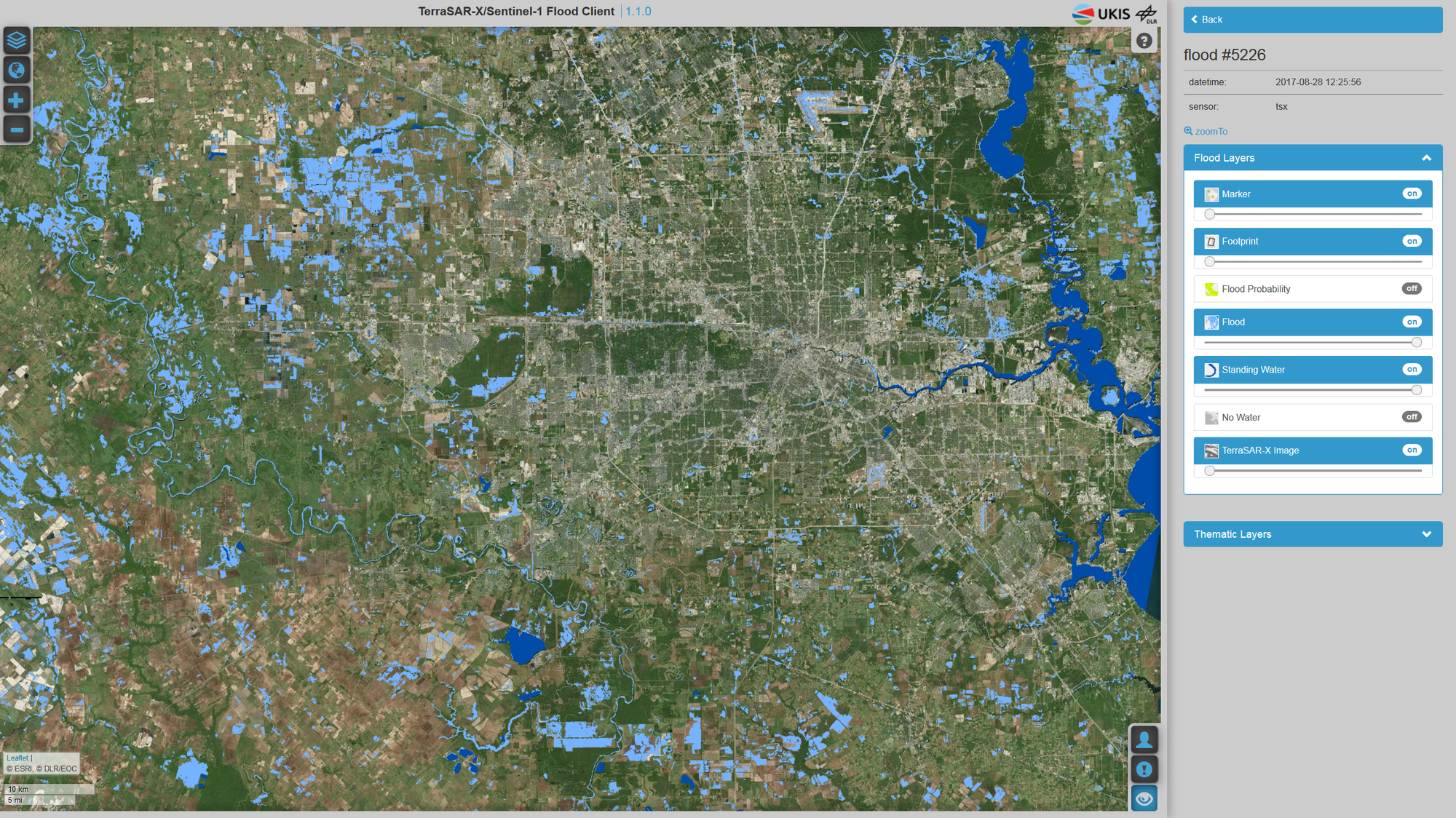 TerraSAR-X Aufnahmen vom 29. August 2017 mit Hochwasserflächen (hellblau) und Fließgewässern (dunkelblau).