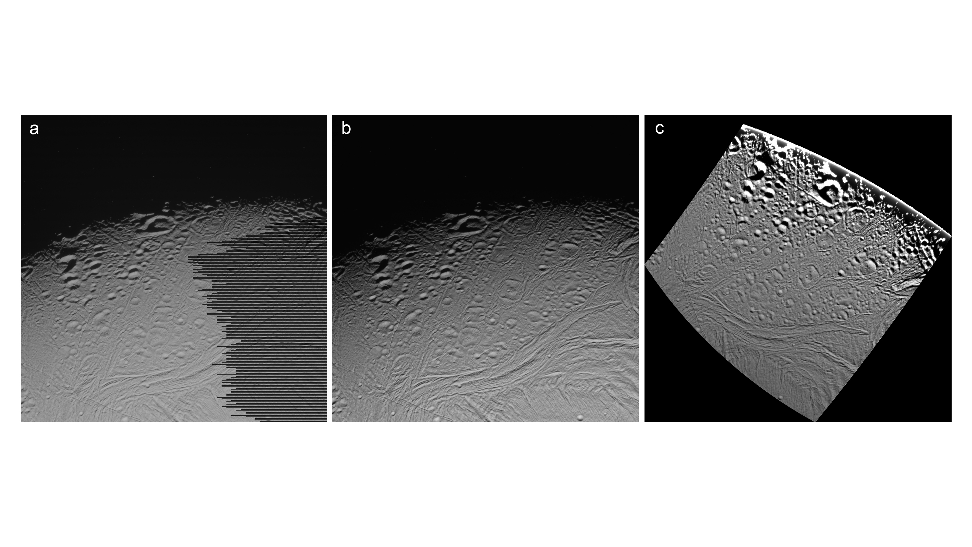 Nachdem die Rohdaten der Cassini-Kameras auf der Erde ankommen, fehlt ihnen nicht nur der räumliche Bezug. Sie können Auslesefehler oder andere Bildfehler enthalten (Abb. links). Nach deren Beseitigung erfolgen weitere Korrekturschritte: Mit einer radiometrischen Kalibration (Mitte) werden Sensorfehler - das "Grundrauschen" in den digitalen Bilddaten oder Bildfehler durch Strahlungseinflüsse - beseitigt. Als letzter Schritt werden die Bilder geometrisch korrigiert, sodass jedes Objekt im Bezug zur Oberfläche und ihrer gegenseitigen Lage richtig dargestellt wird und man an den Rändern der Bilder keinen Versatz zum nächsten Bild sieht. Dann erfolgt das Umwandeln in die gewünschte Kartenprojektion (rechts) und schließlich das Zusammensetzen der Bilder zu einem globalen Mosaik.