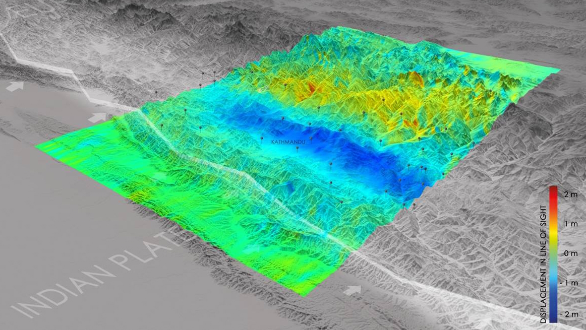 Die mittels Radardaten erstellte Deformationskarte zeigt Verschiebungen von bis zu zwei Metern im Gebiet rund um Kathmandu in Nepal nach dem Erdbeben 2015.