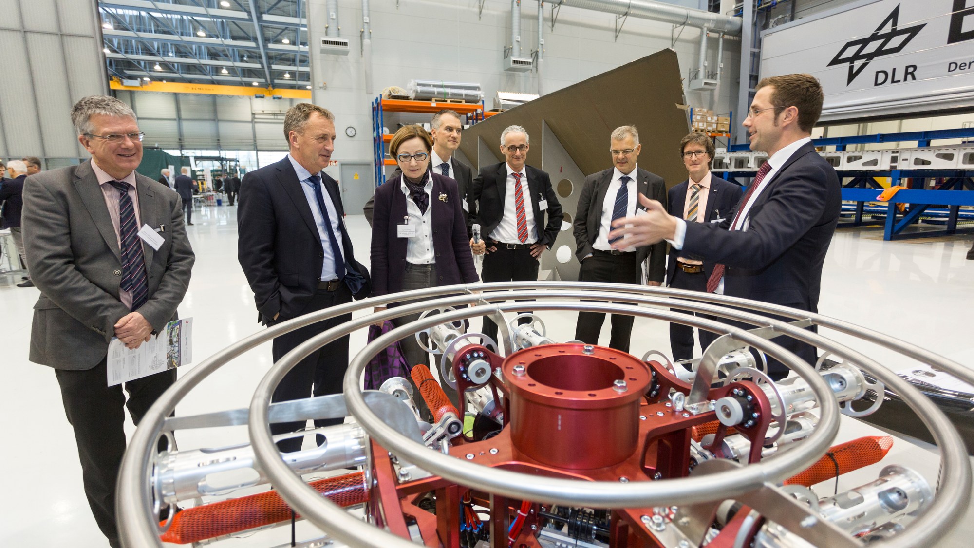 Delegationsrundgang. Von links nach rechts: Hans-Christian Kobow, Klaus Hamacher, Ingelore Hering, Dr. Alexander Roth, Prof. Bernd Mayer, Prof. Martin Wiedemann, Dr. Jan Stüve, Dr. Matthias Meyer. Im Vordergrund: (Erstmalig öffentlich präsentierter) Faser-Legekopf von vom Industrieparner Broetje Automation.
