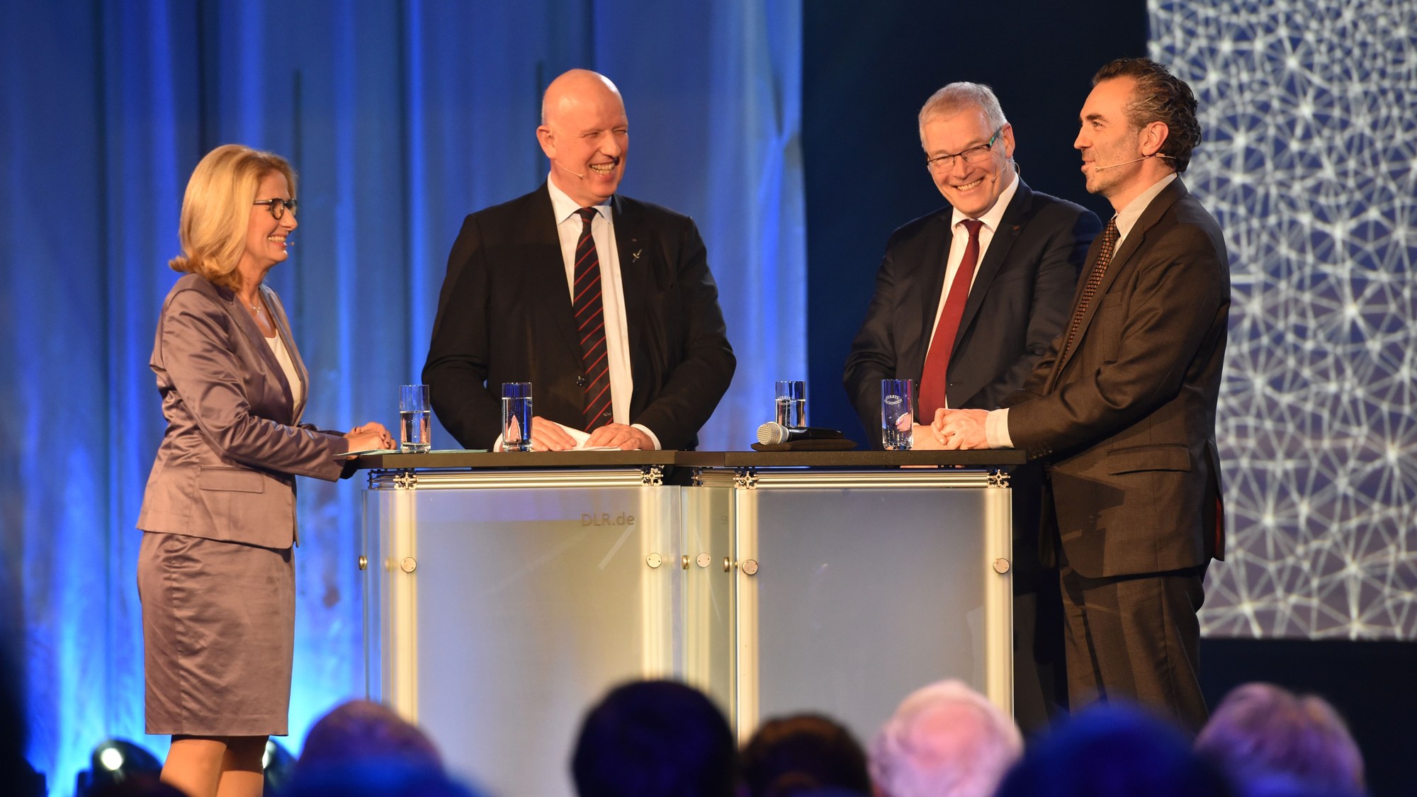 Auf der diesjährigen Jahreshauptversammlung des DLR in Berlin diskutierte die Moderatorin Dr. Christine Kolmar zusammen mit Dr. Gerd Gruppe, DLR-Vorstandsmitglied für das Raumfahrtmanagement, Prof. Rolf Henke, Luftfahrtvorstand des DLR, und Thomas Jarzombek MdB, Sprecher der CDU/CSU Bundestagsfraktion für Digitale Agenda und Vorsitzender der CDU Düsseldorf, (v.l.n.r.) über das Thema Digitalisierung in der Luft- und Raumfahrt.