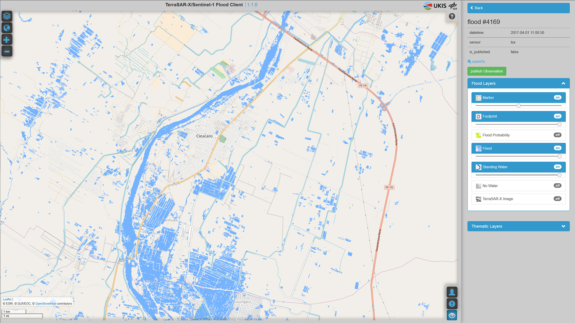 Hochwasserflächen, abgeleitet aus TerraSAR-X Radarsatellitendaten vom 01. April 2017 im Rahmen einer Aktivierung der Internationalen Charta "Space and Major Disasters" in Peru.