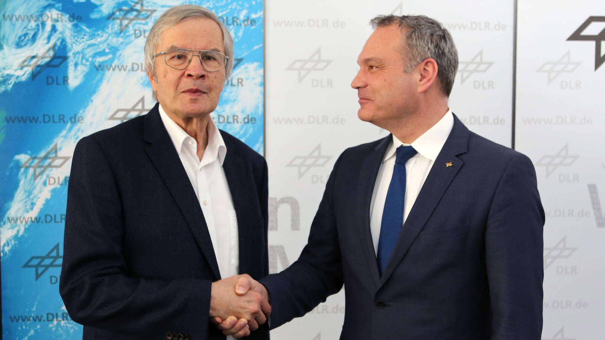 Dr. Walther Pelzer, DLR-Vorstand für das Raumfahrtmanagement, begrüßt den Physik-Nobelpreisträger und Direktor des Max-Planck-Instituts für Quantenoptik in Garching, Prof. Theodor Hänsch, in Bonn.