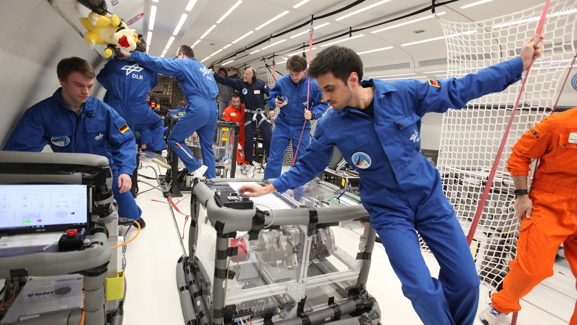 Wie entstehen Sterne? Dieser Frage gingen Wissenschaftler der Fakultät für Physik an der Universität Duisburg-Essen mit ihrem Experiment INKA (Instabile protoplanetare Körper im Niederdruck Windkanal, vorne) bei der 31. DLR-Parabelflugkampagne nach. Auf der Erde wandern Sanddünen, indem der Wind Partikel an der einen Seite abträgt, die durch Gravitation aber auf der Windschattenseite wieder ablagert werden. Doch was würde ohne die Schwerkraft passieren? Die Düne würde sich einfach in eine Wolke aus Sandkörnern auflösen.