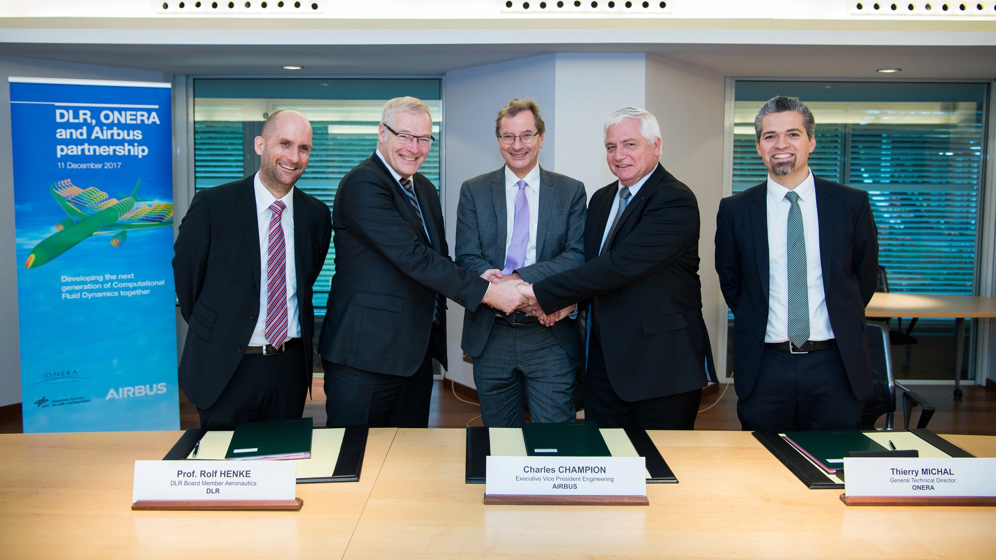 DLR, Airbus und ONERA besiegeln das gemeinsame Abkommen.