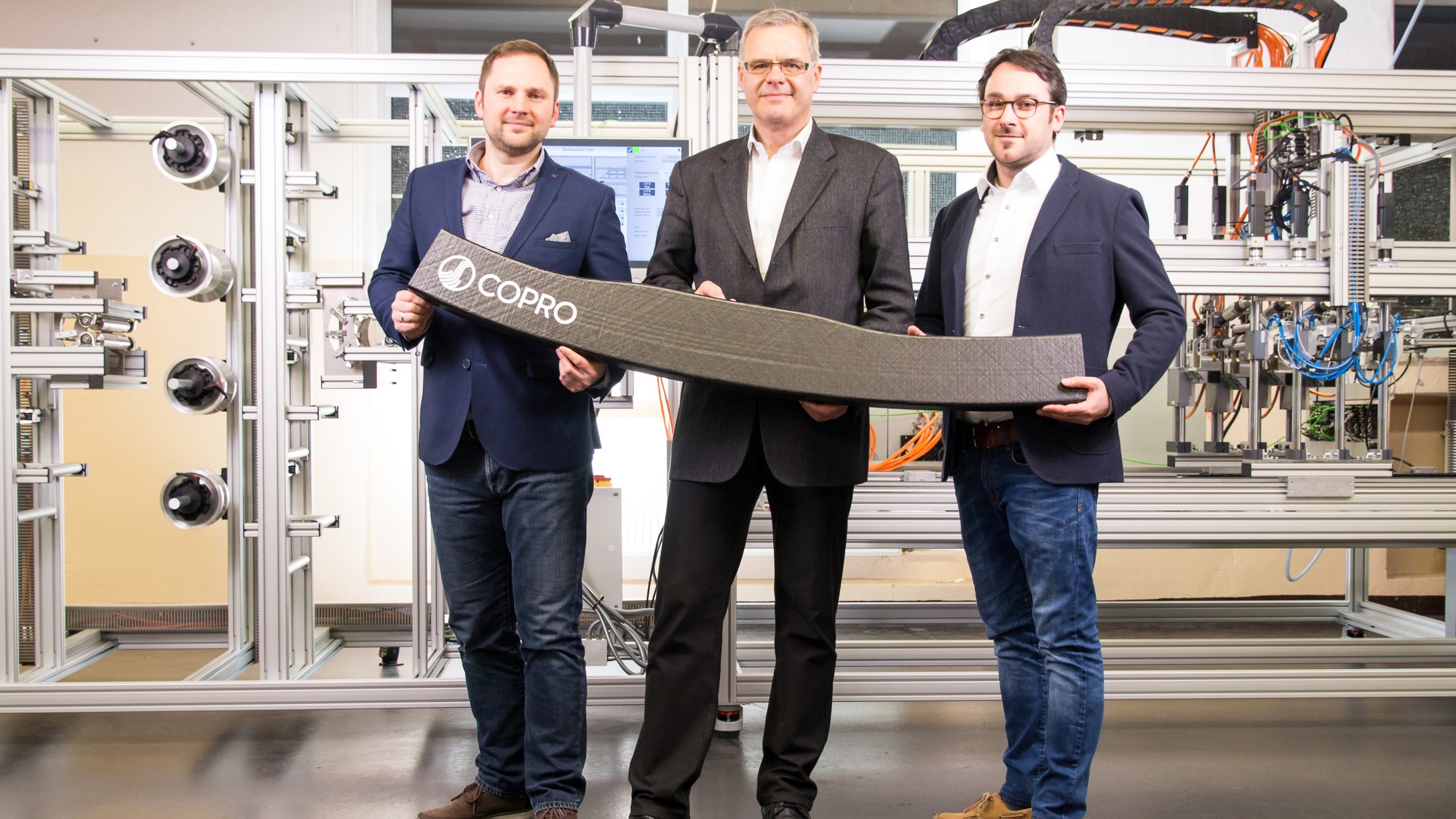 Die Firmengründer der COPRO Technology GmbH Henrik Borgwardt und Arne Stahl mit Prof. Martin Wiedemann vom DLR-Institut für Faserverbundleichtbau und Adaptronik.