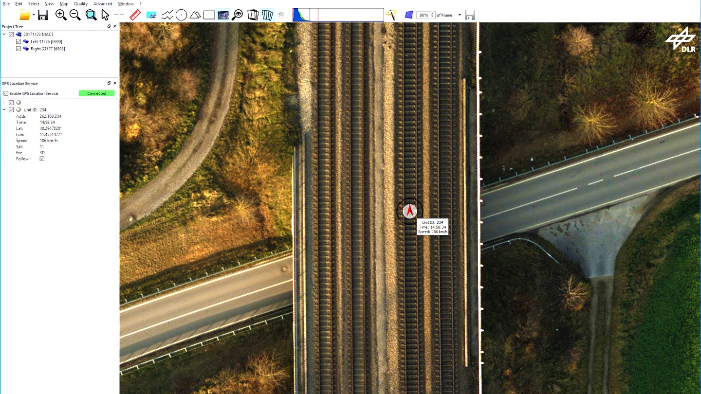 Darstellung der aufgenommenen ICE-Trasse im DLR-Viewer mit Live-Tracking des ICE.