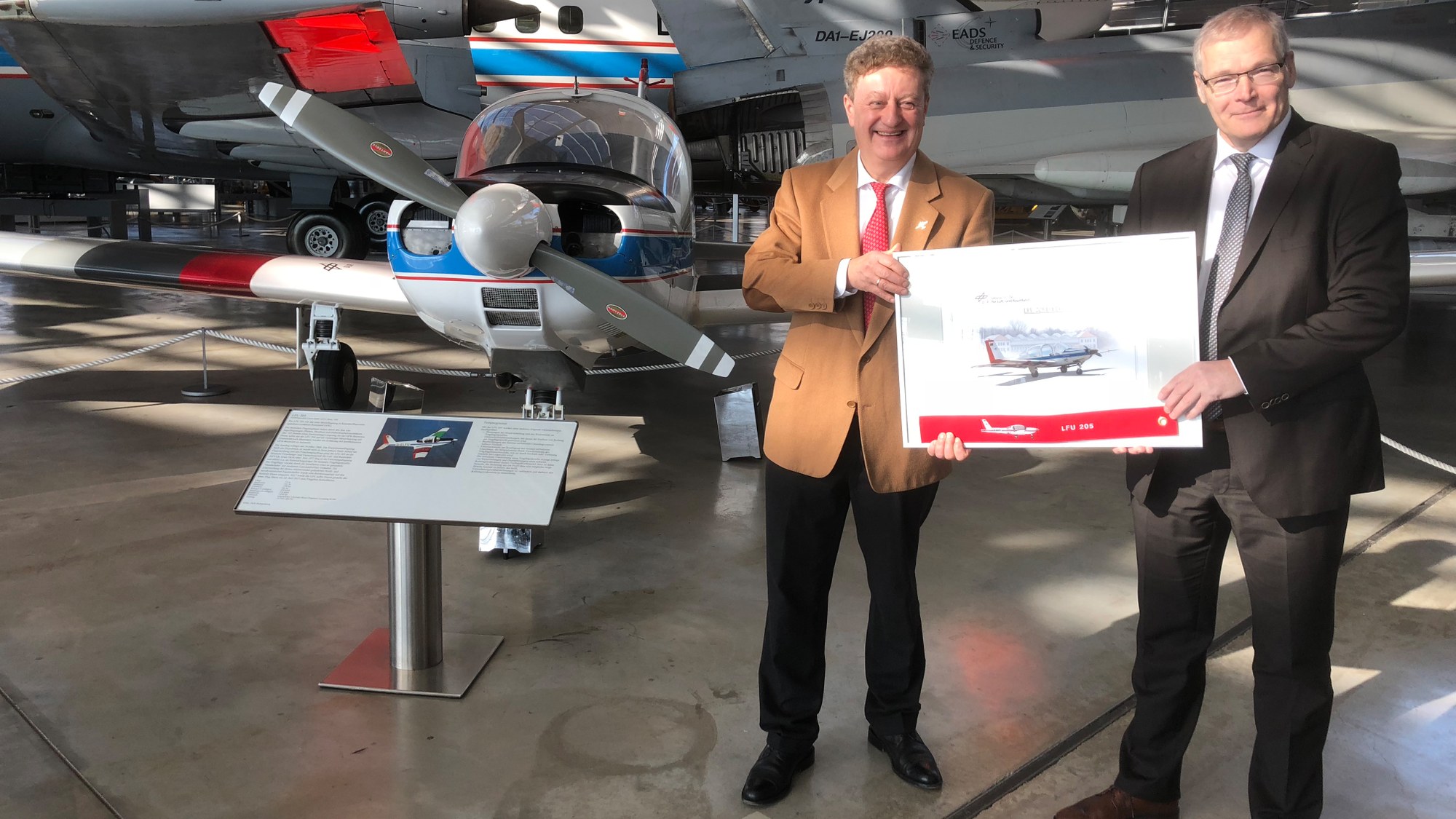 DLR-Luftfahrtvorstand Prof. Rolf Henke (rechts) übergibt die LFU 205 an Prof. Wolfgang Heckl, Direktor des Deutschen Museums in München.