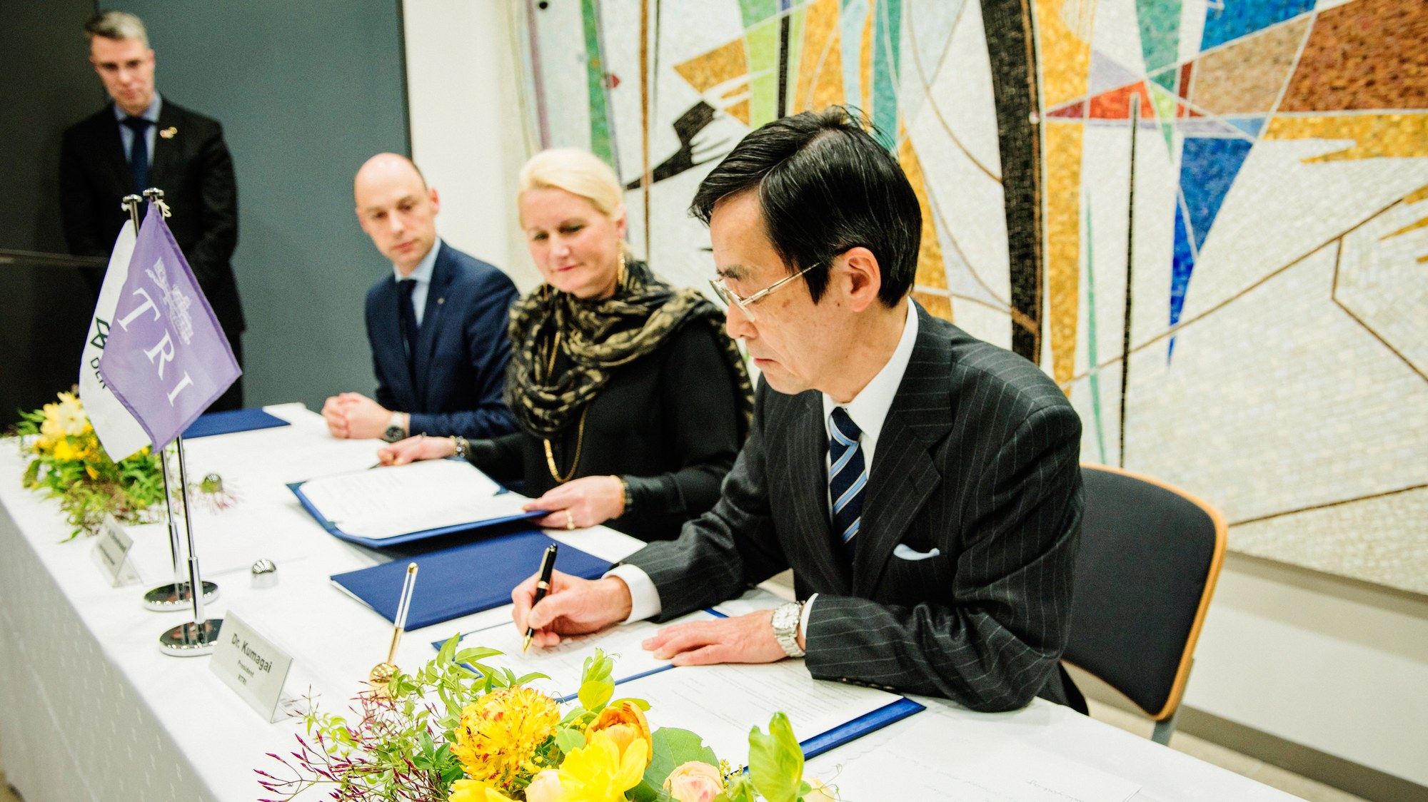 Prof. Pascale Ehrenfreund, Vorstandsvorsitzende des DLR und Dr. Norimichi Kumagai, Präsident des RTRI bei der Vertragsunterzeichnung.