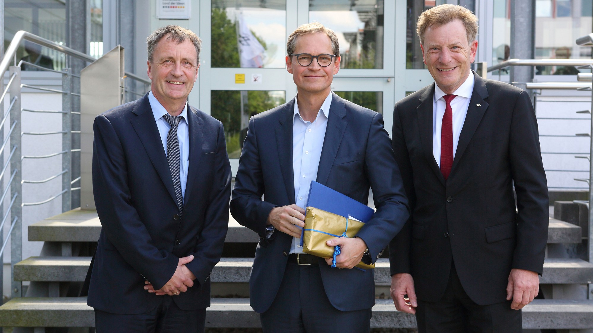 Michael Müller (Mitte) wurde am Standort von DLR-Vorstandsmitglied Klaus Hamacher (Links) und Peter Georgino, Leiter der Standorte Berlin, Neustrelitz, Jena und Dresden, begrüßt. Unter anderem sprachen sie mit dem Regierenden Bürgermeister über ein geplantes Bauvorhaben, damit die Mitarbeitenden der Abteilung Triebwerksakustik des Instituts für Antriebstechnik von Charlottenburg nach Adlershof umsiedeln können.