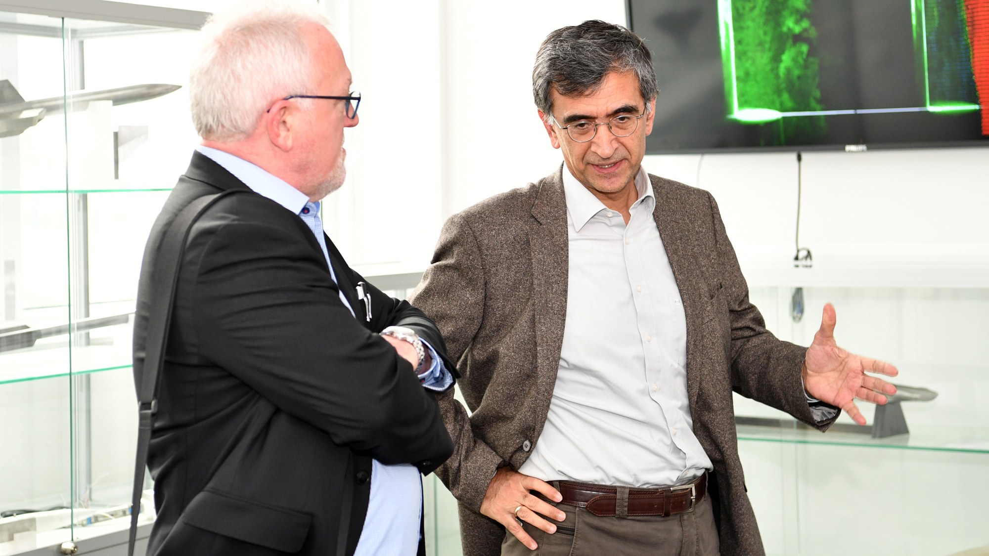 In der Abteilung Überschall- und Hyperschalltechnologien des DLR-Instituts für Aerodynamik und Strömungstechnik stellte Dr. Ali Gülhan (rechts) die Arbeiten seiner Abteilung vor.