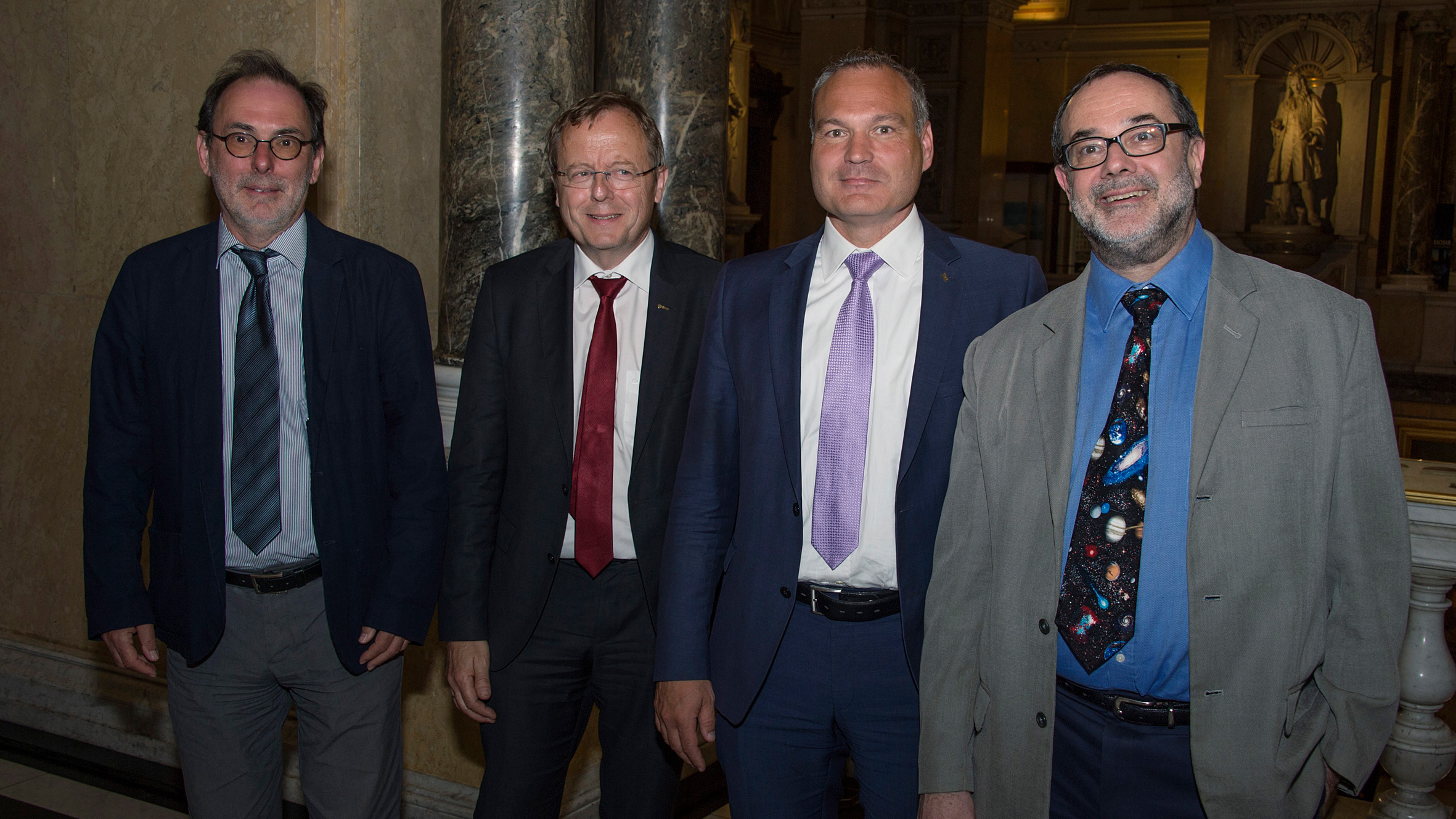 DLR-Institutsdirektor a.D. Prof. Tilman Spohn, ESA-Generaldirektor Prof. Johann-Dietrich Wörner, DLR-Vorstandsmitglied Dr.-Ing. Walther Pelzer und NHM-Direktor Prof. Christian Köberl (von links nach rechts).