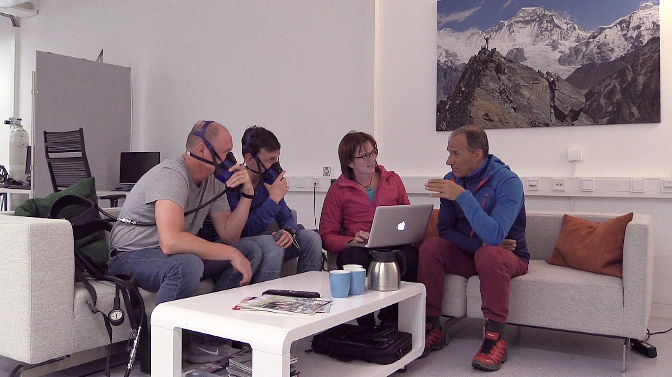 Während die Probanden der sauerstoffarmen Luft ausgesetzt sind, betreten die Ärzte des DLR das Wohnmodul der beiden nur mit einer Sauerstoffversorgung über eine Maske.