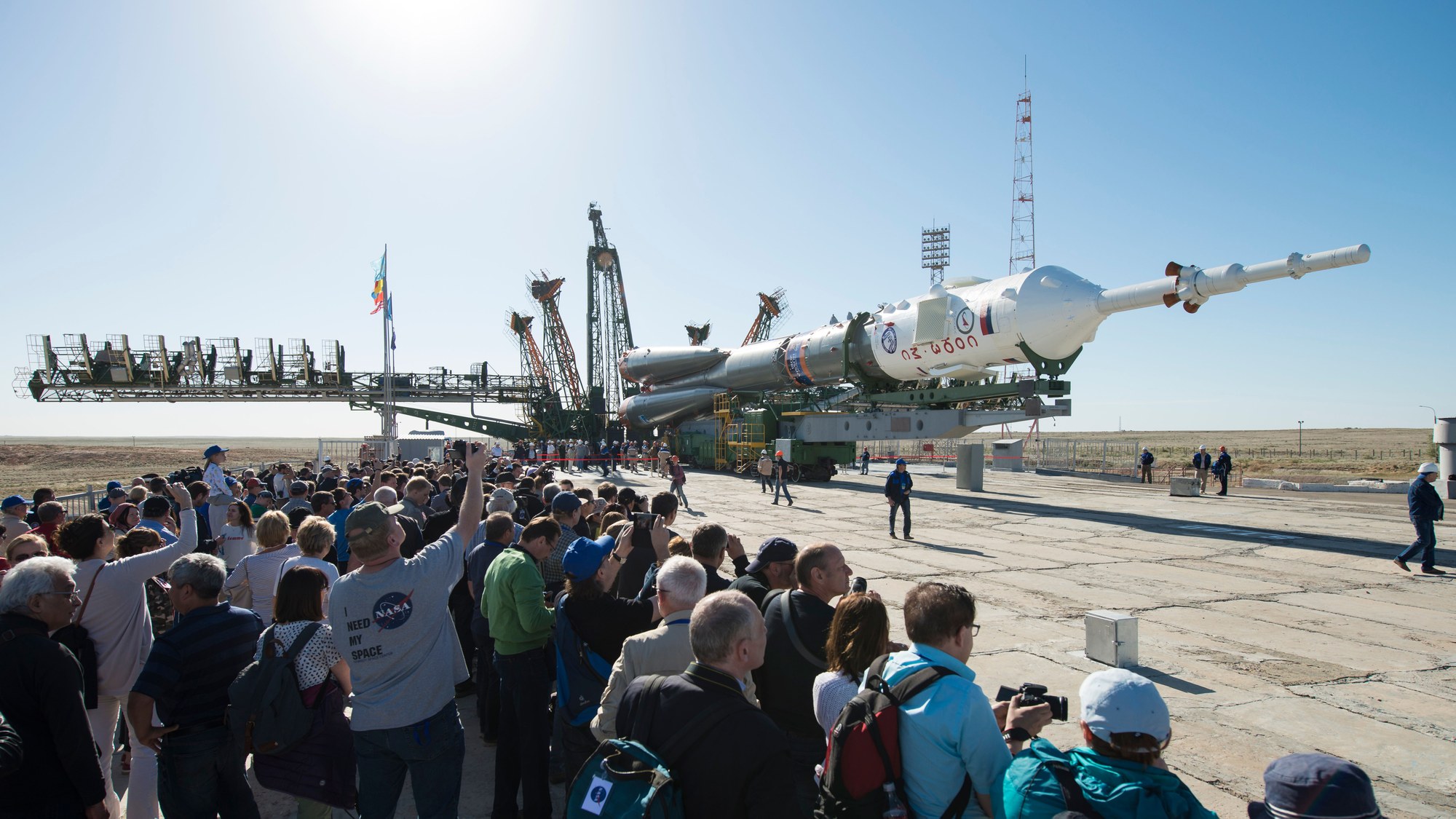 Die Sojus-Rakete ist unter den Augen zahlreicher Beobachter an der Startrampe angekommen und wird nun aufgerichtet.