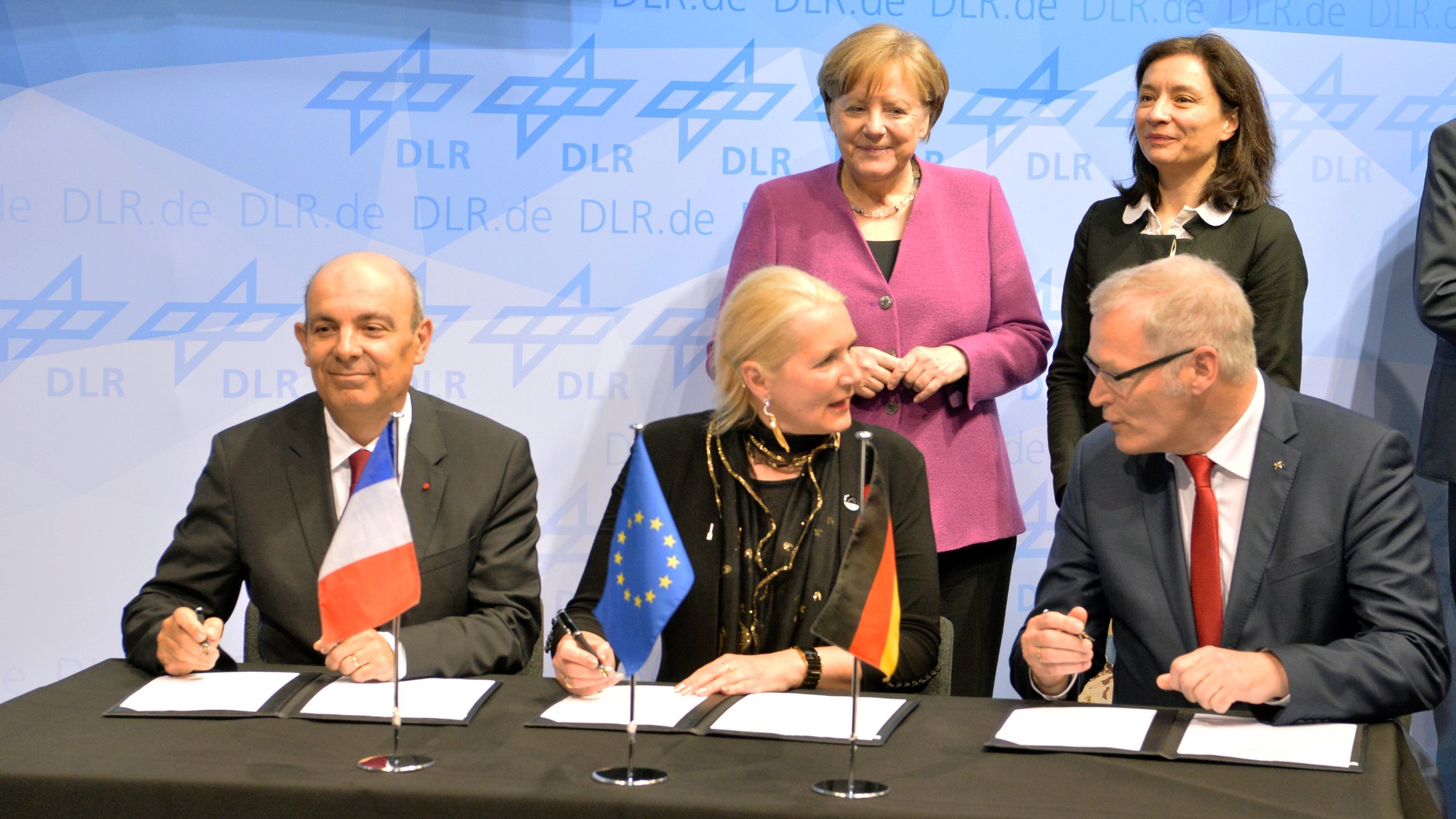 Die Vereinbarung beinhaltet die Lieferung des Flugzeugs und dessen Umwandlung zum Flugversuchsträger iSTAR (in-flight Systems and Technology Airborne Research). (v.l.n.r) Eric Trappier, GIFAS´ Präsident und CEO der Dessault Aviation, Prof. Dr. Pascale Ehrenfreund, Vorstandsvorsitzende des DLR, Bundeskanzlerin Angela Merkel, Delphine Gény-Stephann, Staatssekretärin im französischen Wirtschaftsministerium und Prof. Rolf Henke, Vorstand für den Bereich Luftfahrt im DLR.