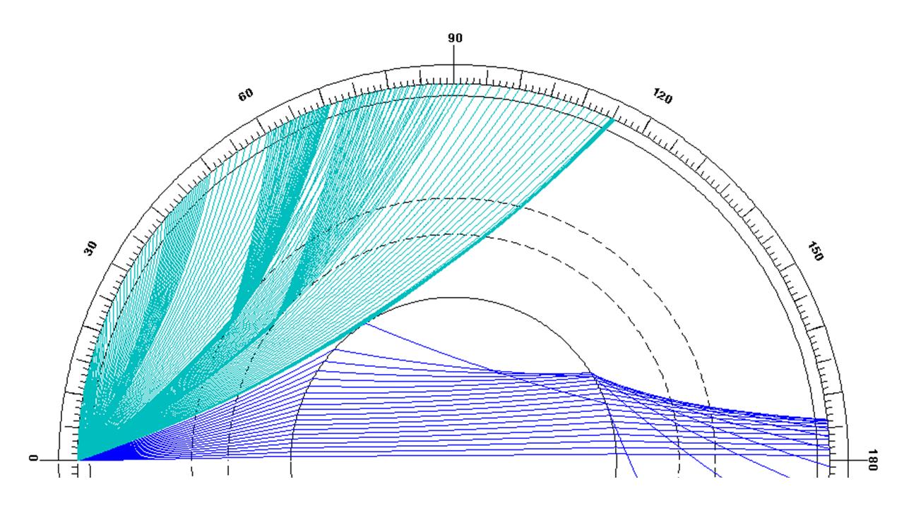 Wege seismischer Strahlen (P und PKP-Wellen) im Mars, wie sie sich aus einem derzeitigen Modell ergeben. Ein Marsbeben an der Oberfläche, links bei "0" strahlt in den Mantel ab. Ab einer Entfernung von 115 Grad (auf dem Mars circa 6800 Kilometer) und bis in eine Entfernung von circa 174 Grad wirft der Kern einen "Schatten". In Blau: Wege durch den Kern; in Grün: Wege durch den Mantel; gestrichelte Linien: Tiefenlage von druckabhängigen Mineralumwandlungen, wo sich die Dichte des Gesteins sprunghaft ändert, was auch zur Reflexion der Wellen führen kann.