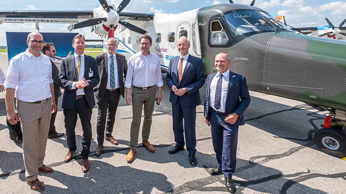 Am Sonder- und Forschungsflughafen Oberpfaffenhofen präsentierte das DLR und die Unternehmen Siemens, MTU Aero Engines und RUAG Aviation die Schlüsseltechnologie des elektrischen Fliegens: hybrid-elektrische Antriebe, für Mittelstreckenflugzeuge bis hin zu Lufttaxis. Im Bild (von links): Michael Kießling - Mitglied des Deutschen Bundestages, Dr. Stefan Weber - MTU Aero Engines AG, Prof. Rolf Henke - DLR-Vorstand für Luftfahrtforschung, Andreas Scheuer - Bundesminister für Verkehr und digitale Infrastruktur, Dr. Frank Anton - Head eAircraft Siemens AG, Urs Breitmeier CEO RUAG.