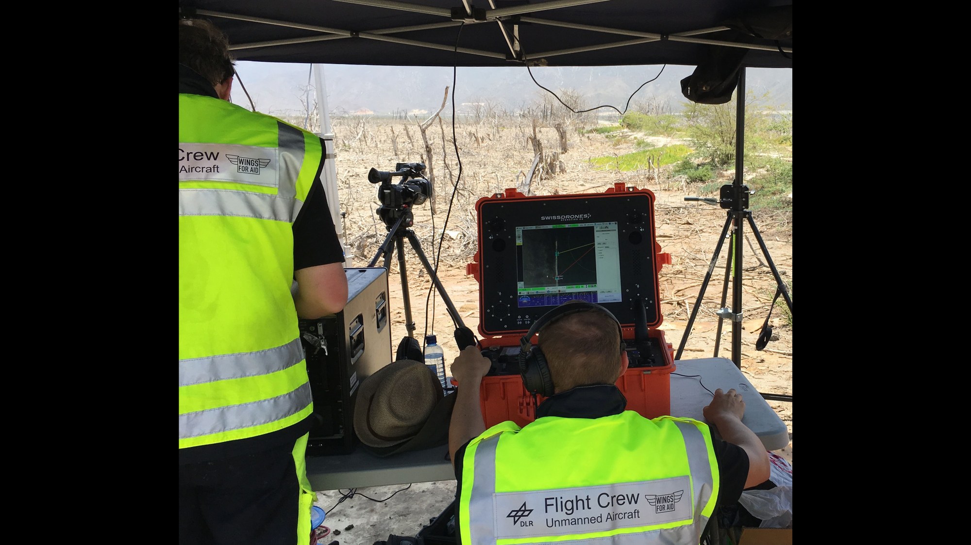 Über eine Distanz von sechs Kilometern flog der unbemannte Hubschrauber des DLR autonom über den Salzsee Enriquillo in der Dominikanischen Republik. An der Bodenstation überwachen die Wissenschaftler des DLR den Flug des unbemannten Hubschraubers vom Start bis zur Landung.