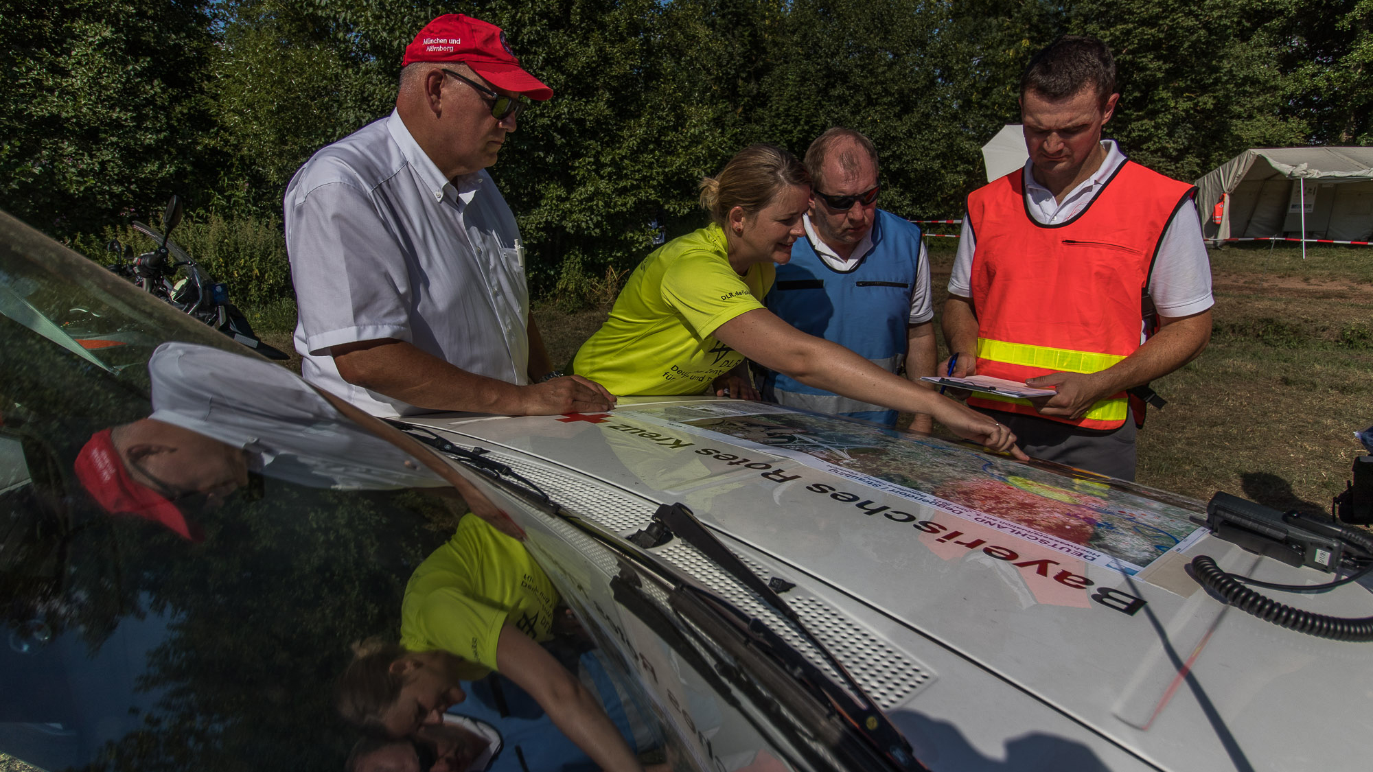Bei der Vorstellung ihrer Einsatzgruppe simulierte das BRK auch eine Lagebesprechung. Mit dabei: Veronika Gstaiger vom DLR-Projekt VABENE++ (2.v.l.). Auf Basis von Fernerkundungsdaten unterstützen das Zentrum für satellitengestützte Kriseninformationen und VABENE++ die SEG bei der Einsatzplanung.