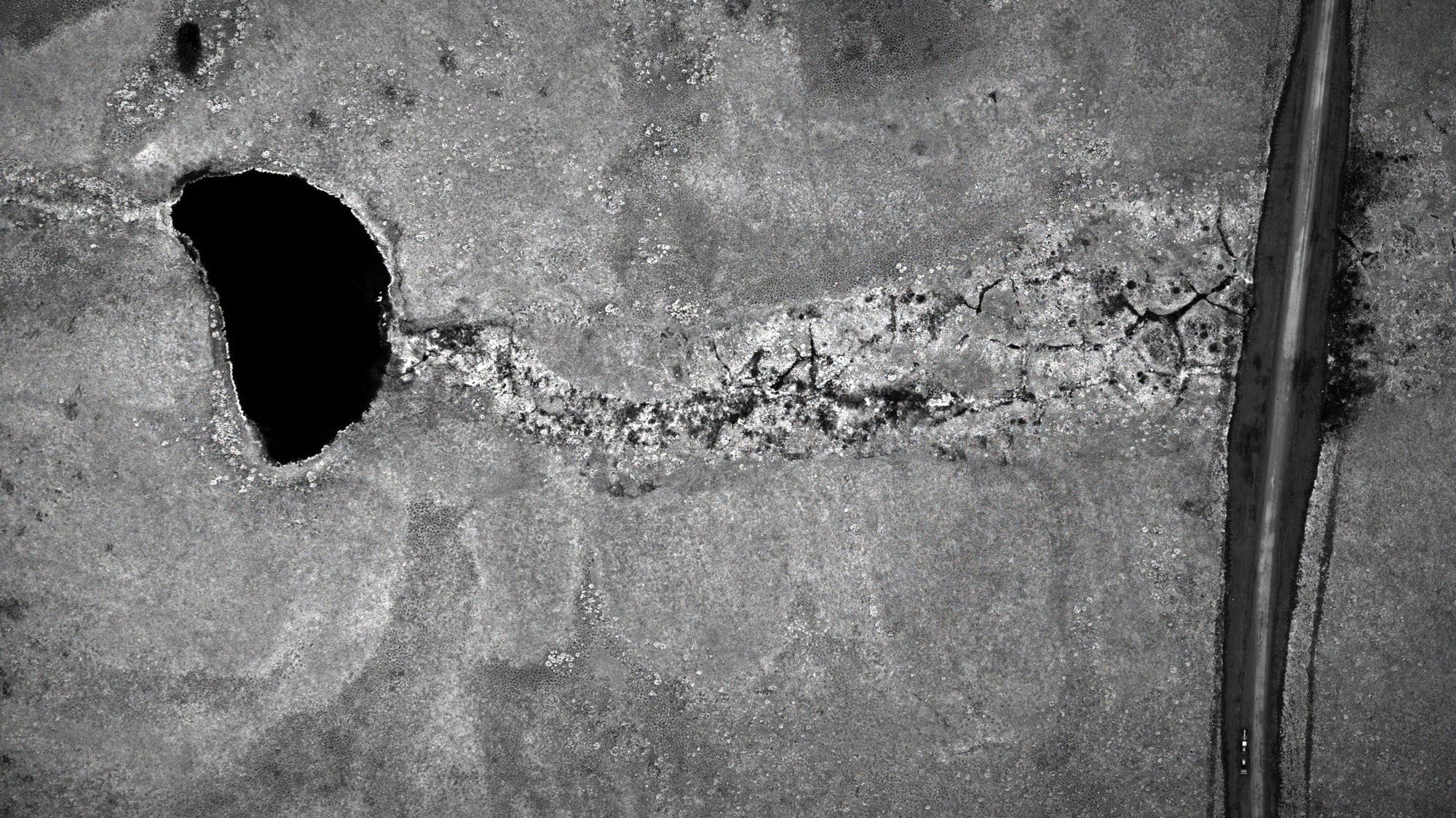 Die Aufnahme wurde während eines Fluges nähe Inuvik im Nordwesten Kanadas erstellt. Sie zeigt dasselbe Motiv wie die vorherige Farbaufnahme und hat eine Auflösung von 15 Zentimetern.