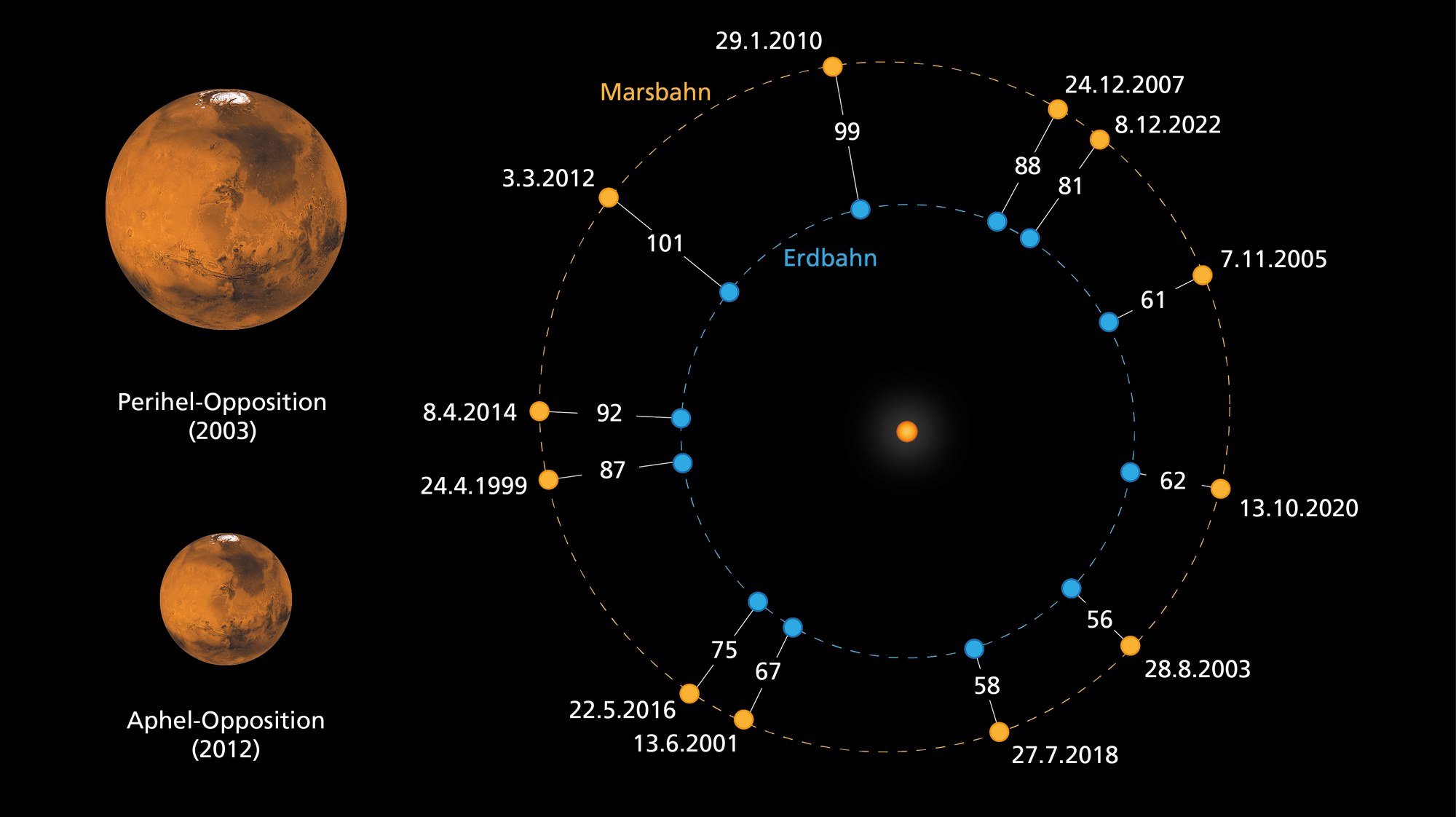Während der Mondfinsternis wird auch der Nachbarplanet Mars ca. 6 ° unterhalb des Mondes gut zu sehen sein. Er befindet sich, von der Erde aus betrachtet, in Opposition zur Sonne und steht mit dieser und der Erde dann auf einer Linie. Die Grafik zeigt im rechten Teil die verschiedenen Oppositionsstellungen des Mars im Zeitraum von 1999 bis 2022. Die jetzige Opposition findet nahe am sonnennächsten Punkt, dem Perihel seiner Bahn statt, weswegen Mars der Erde nach 15 Jahren mit 58 Millionen Kilometern wieder sehr nahe kommt. Man spricht auch von einer großen Marsopposition. Mars ist dann bereits in einem kleinem Fernglas oder Teleskop deutlich größer und heller zu sehen als bei einer sonnenfernen Aphelopposition (linker Teil der Grafik).