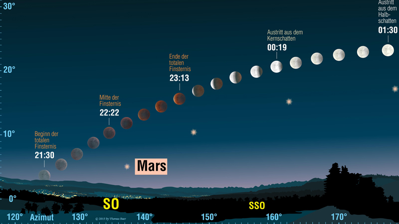 Die Grafik zeigt den Verlauf der Finsternis für Süddeutschland und der Schweiz. Im Süden Deutschlands ist die Mondfinsternis am besten zu sehen, da der Mond dort bis zu 16 Grad über den Horizont steigt, im Norden dagegen bis zum Ende der Totalität nur eine Höhe von maximal zehn Grad erreicht. Für Beobachter ist es daher unerlässlich, einen möglichst erhöhten Standort zu finden, an dem eine freie Sicht bis zum südöstlichen und südlichen Horizont besteht. Im Osten Deutschlands wird der Mond etwas früher aufgehen und eine etwas längere Beobachtungszeit der Verfinsterung ermöglichen.