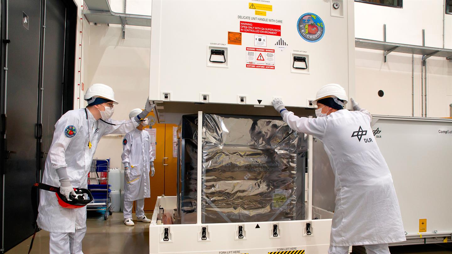Per Luftfracht wird der Satellit Eu:Cropis in einer Kiste nach Kalifornien zum Start transportiert.