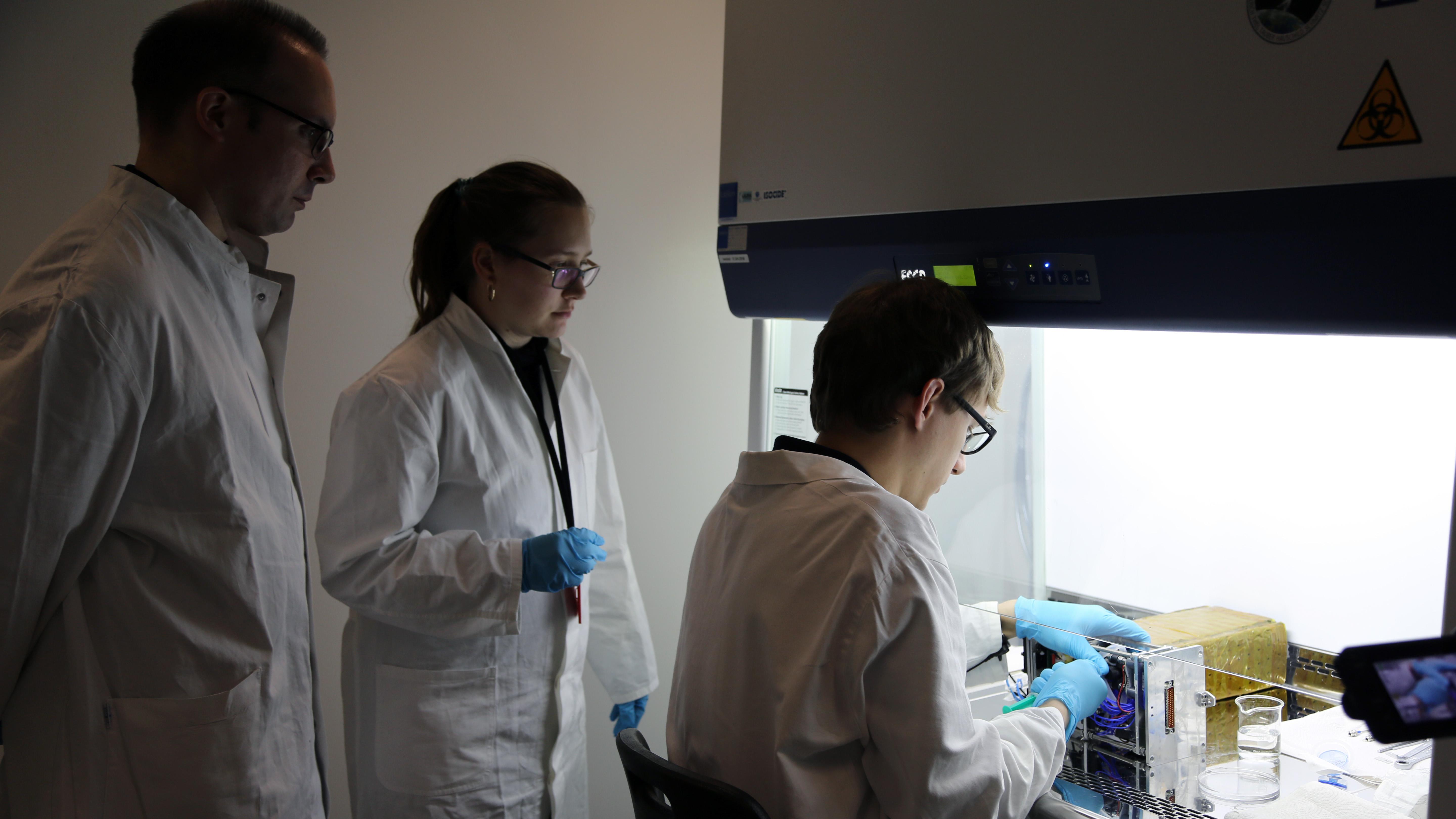 Zwei Tage vor dem Raketenstart werden die Foraminiferen in die Experimentapparatur eingespritzt. Das Team FORAREX (FORAminifera Rocket Experiment) von der Universität Bremen hat für die Untersuchungen ein Lebenserhaltungssystem konzipiert, das den einzelligen Lebewesen optimale Umgebungsbedingungen garantiert.