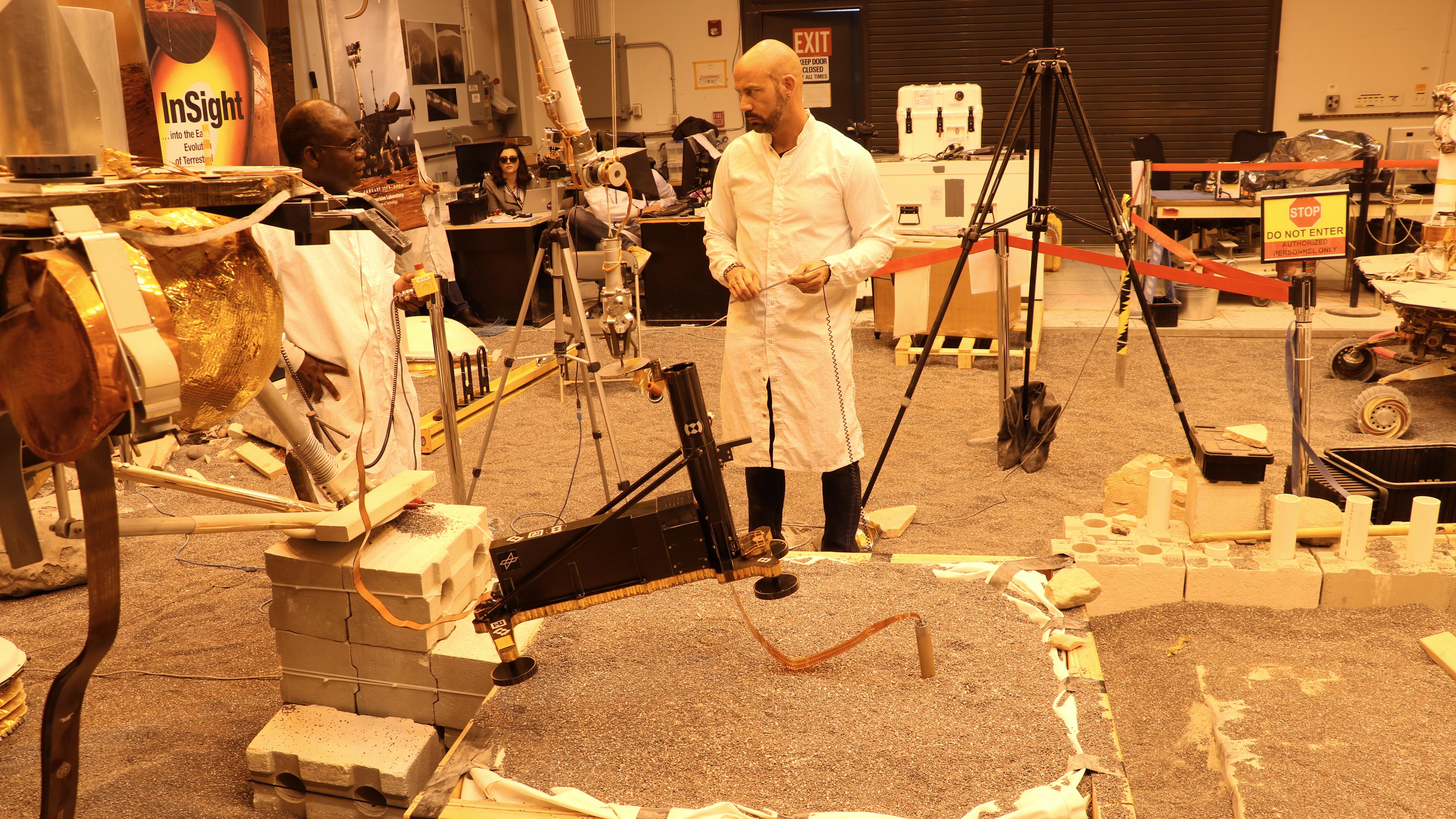 In einem der Situation auf dem Mars nachgestellten Testumgebung im Jet Propulsion Laboratory der NASA untersuchen die Wissenschaftler und Ingenieure mögliche Strategien zur Unterstützung des Heat Flow and Physical Properties Package (HP3) auf dem InSight-Lander.