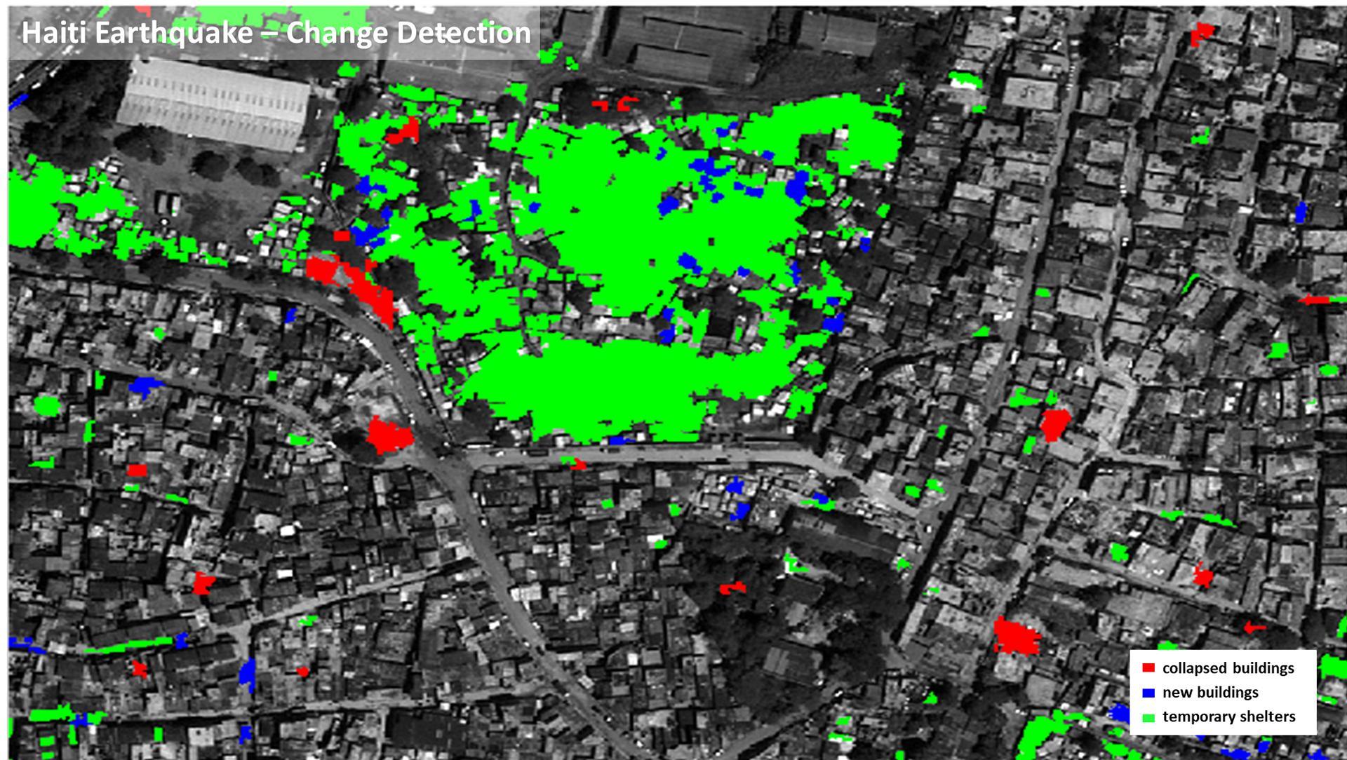 Am 12. Januar 2010 erschütterte ein schweres Erdbeben Haiti. In dem Nachher-Bild vom 18. August 2010 ist markiert, welche Gebäude weiterhin zerstört sind, wo neue Gebäude errichtet wurden und die genaue Verbreitung notdürftiger Unterkünfte. Die Veränderungen der Gebäude wurden dabei automatisch erfasst. Das DLR Earth Observation Center nutzte dazu Verarbeitungsmethoden, die auf maschinellem Lernen basieren, und Daten des Fernerkundungssatelliten GeoEye-1 mit einer Auflösung von 0,5 Meter.