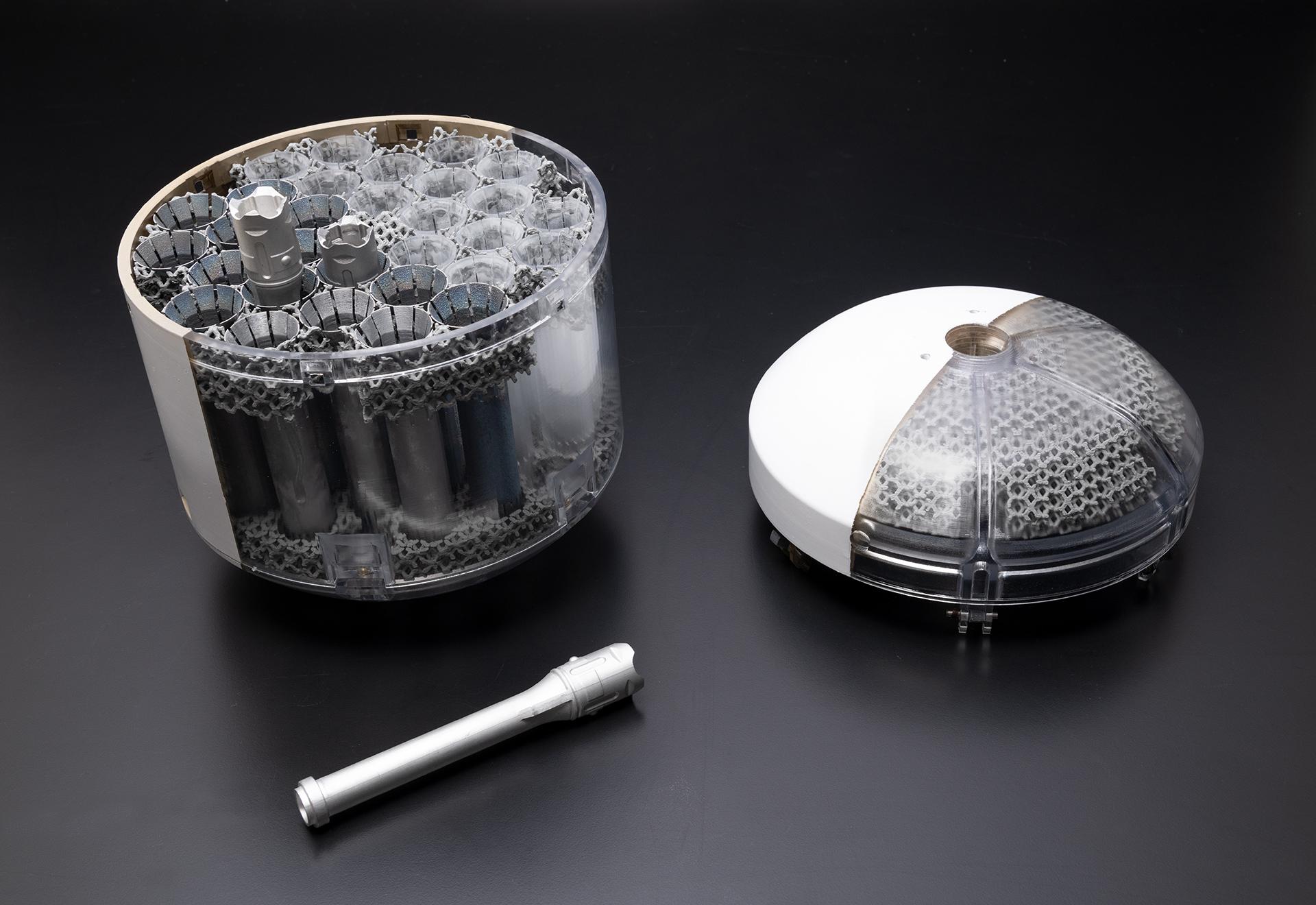 Erstmals werden bei einer Marsmission Proben für einen Transport zur Erde gesammelt und vorbereitet werden. Der Mars 2020 Rover Perseverance wird während seiner Fahrt durch den Krater Jezero Gesteins- und Bodenproben sammeln, die er mit dem Bohrwerkzeug am Revolverkopf des mobilen Instrumentenarms von Perseverance erbohren und in zylindrischen Metallröhrchen verstauen wird. Das Bild zeigt ein Modell des teilweise bestückten Probenbehälters, eines Metallröhrchens für das Marsgestein und die Abdeckung des Probenbehälters. Gemeinsam entwickeln NASA und ESA gegenwärtig Konzepte für die Mars-Probenrückführungsmission, die für die frühen 2030er-Jahre vorgesehen ist.