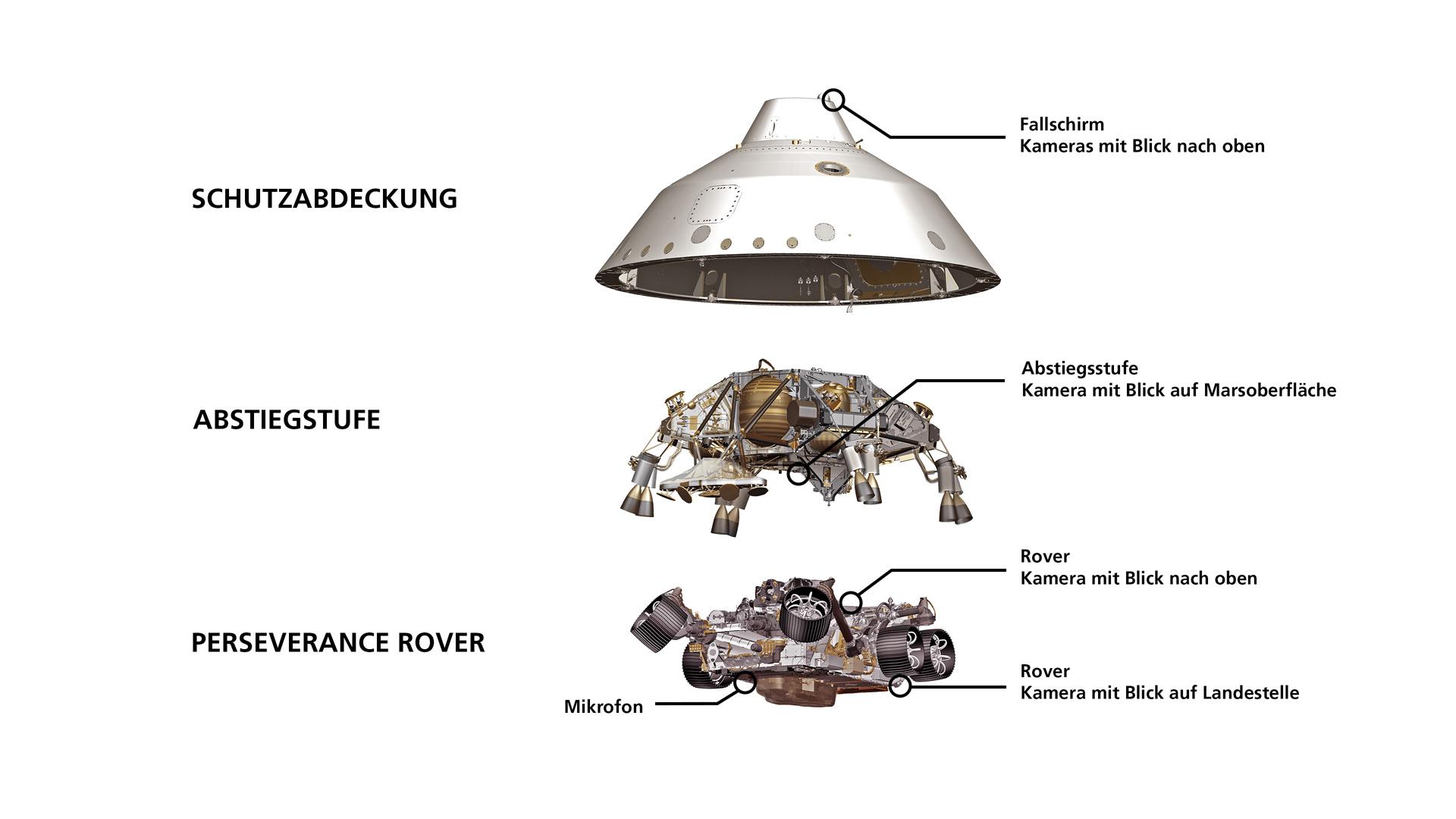 Rover, Landestufe und rückwärtiges Schild sind mit Kameras versehen, um die Eintritts-, Abstiegs- und Landephase der Mission genau zu beobachten. Diese Grafik zeigt die genaue Position der vier Kameras und eines Mikrofons auf den drei Elementen. Das Mikrofon wird die Geräusche währendes des Abstiegs durch die Marsatmosphäre aufzeichnen und zur Erde übertragen. Mit den Kameras können sowohlohl das Öffnen der Fallschirme und das Wegfliegen der Landestufe mit den rückwärts blickenden Kameras (Up-Look Camera), als auch das Absetzen des Rovers und die Landestelle mit den nach unten blickenden Kameras (Down-Look Camera) genau gefilmt werden.