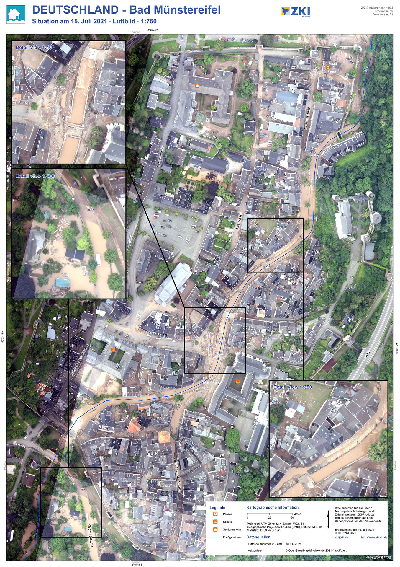 Die Karte zeigt die Hochwassersituation in Bad Münstereifel (Kreis Euskirchen, Nordrhein-Westfalen) am 15.07.2021.