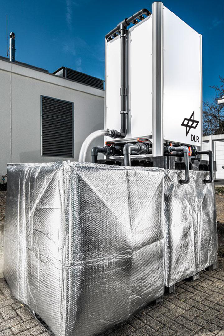 Der Reaktionsraum (oben) beinhaltet Trägermaterialien, auf denen Mikroorganismen siedeln. Der untere Behälter ist ein Tank. Die platzsparende Anlage eignet sich für den Einsatz in landwirtschaftlichen Betrieben.