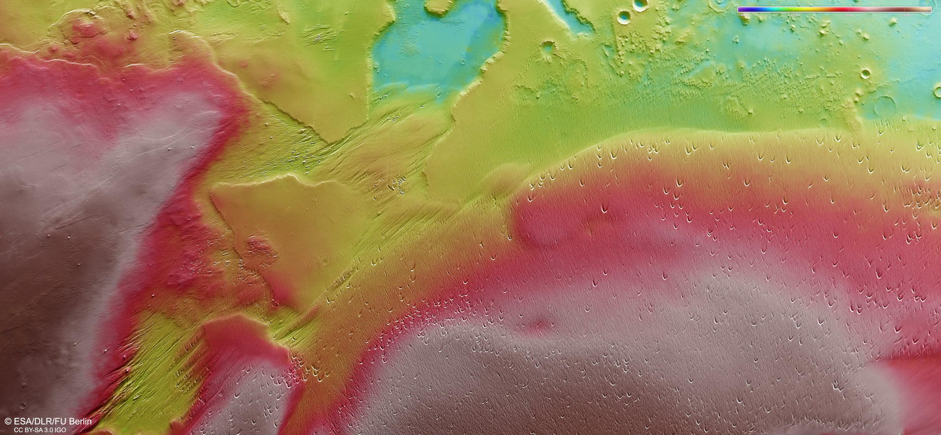 Die DLR-Stereokamera HRSC (High Resolution Stereo Camera) auf der ESA-Raumsonde Mars Express nimmt mit ihren neun quer zur Flugrichtung angeordneten Sensoren die Marsoberfläche unter verschiedenen Winkeln und mit vier Farbkanälen auf. Aus den vier schräg blickenden Stereokanälen und dem senkrecht auf den Mars gerichteten Nadirkanal berechnen Wissenschaftlerteams am DLR-Institut für Planetenforschung und der Freien Universität Berlin digitale Geländemodelle, die jedem Bildpunkt eine Höheninformation zuordnen. Aus der Farbskala rechts oben im Bild gehen die Höhenunterschiede in der Region hervor: Die flachen Bergkuppen im Süden und Osten (Norden ist rechts im Bild) erheben sich zwischen 1.500 und 2.000 Meter über die türkisfarbenen Senken im Westen am oberen Bildrand. Zwischen den Erhebungen der Bergkette von Eumenides Dorsum erkennt man das tieferliegende Gebiet mit seinen Jardangs, Windgassen und Blowouts, die durch langanhaltende Winderosion entstanden sind.