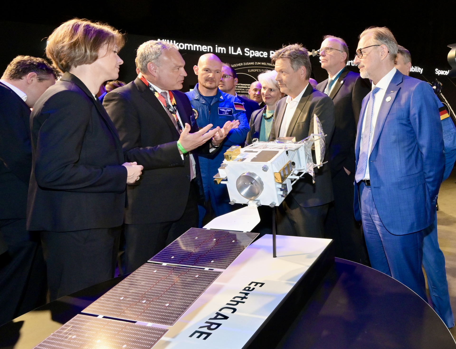 Bundeswirtschaftsminister Robert Habeck am Exponat des Erdbeobachtungssatelliten EarthCARE mit Dr. Walther Pelzer, Vorstandsmitglied des DLR und Generaldirektor der Deutschen Raumfahrtagentur im DLR, ESA-Astronaut Alexander Gerst, Marco Fuchs, Vorstandsvorsitzender von OHB, und ESA-Generaldirektor Josef Aschbacher (von links).