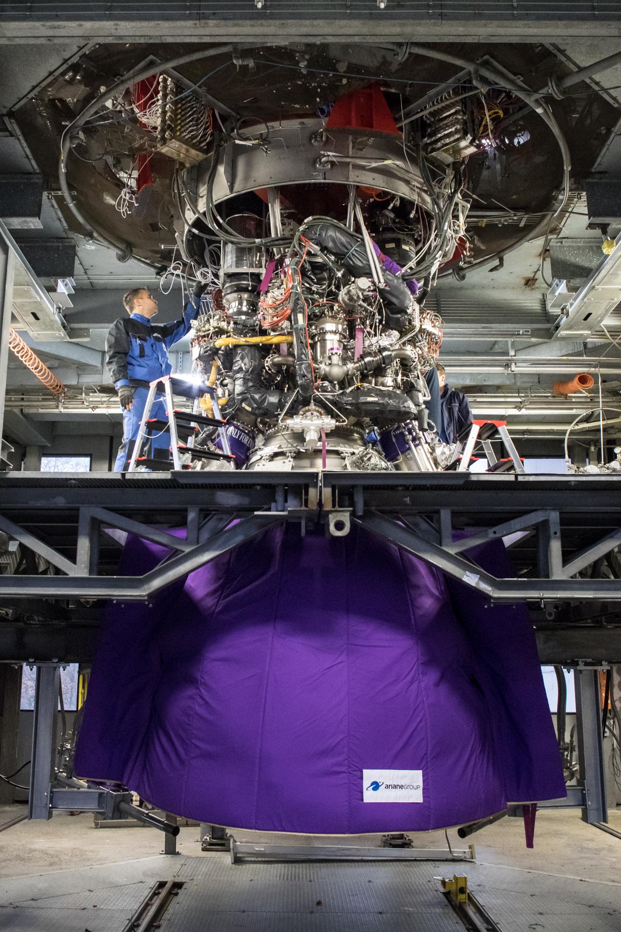 Einbau des Hauptstufentriebwerks Vulcain 2.1 am ESA-Prüfstand P5