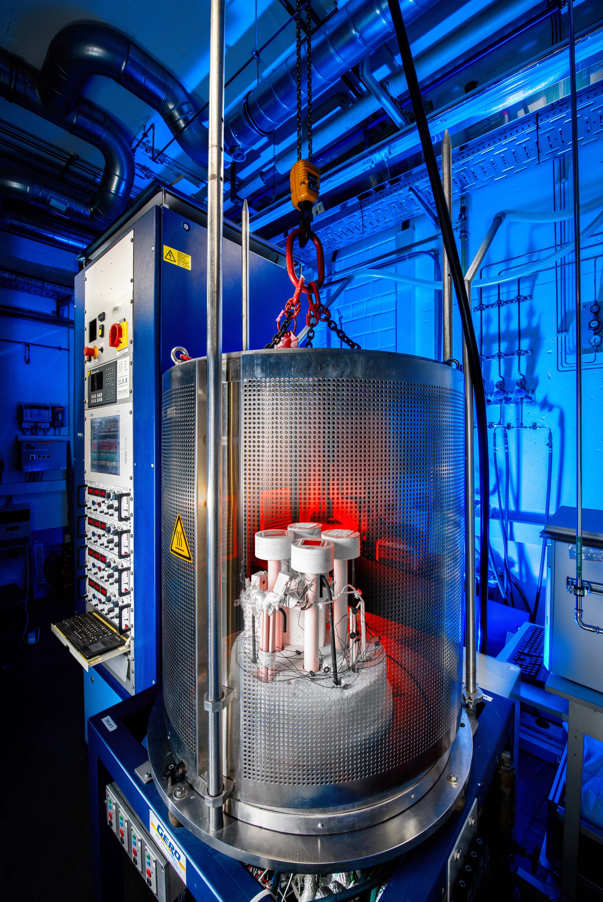 Im DLR-Institut für Technische Thermodynamik steht der Hochtemperaturprüfstand für Brennstoffzellen zur Produktion von Strom aus Wasserstoff bzw. zur Herstellung von Wasserstoff aus Wasserdampf mittels Elektrolysezellen. Der Prüfstand verfügt über vier Prüfpositionen, in denen das Gas unabhängig durch die Keramikrohre zugeführt wird. Beim Elektrolysebetrieb (SOEC) wird Dampf zugeführt mit dem Ziel, Wasserstoff zu erzeugen. Für den Brennstoffzellenbetrieb wird Wasserstoff zur Stromerzeugung zugeführt. Der transparente Bereich zeigt die Testanordnung mit den Zellen und der Instrumentierung im zylindrischen Ofen, sowie die vier elektronischen Lasten im blauen Schaltschrank (eine pro Zelle), die den Strom aus den Zellen ziehen (Brennstoffzellenbetrieb) oder den Strom liefern (Wasserelektrolysebetrieb).