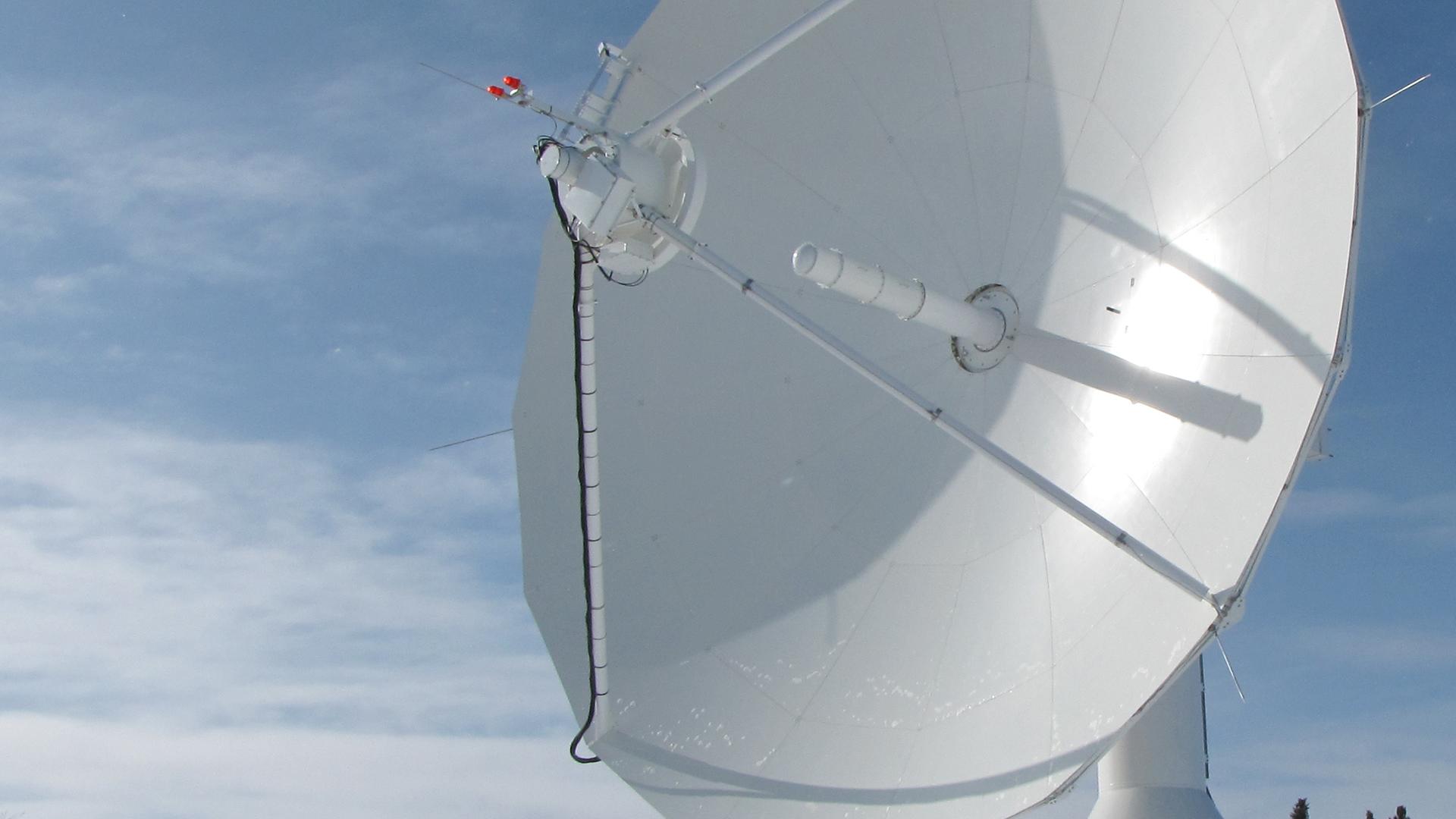 Hauptreflektor mit Fokus auf S-Band Feed und Subreflektor mit Fokus auf X-Band Feed im Mittelpunkt des Hauptreflektors