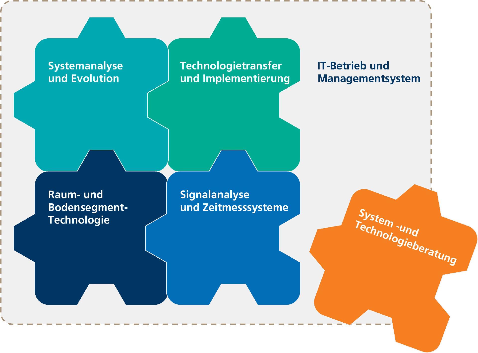 Die Organisation spiegelt die grundlegenden Themenkomplexe wider, die für die Weiterentwicklung des Galileo Systems notwendig sind. Von besonderer Bedeutung ist die sehr enge interne Vernetzung zwischen den entsprechend aufgesetzten Abteilungen.