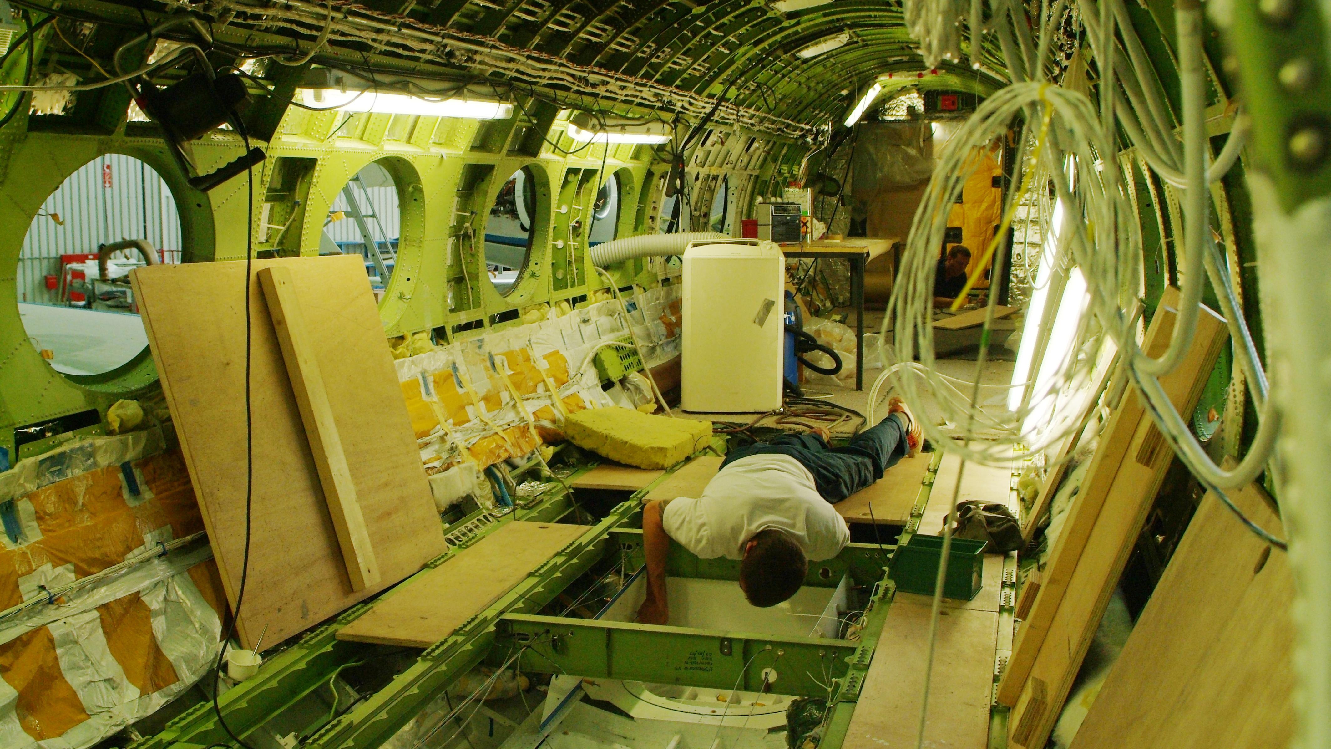 Aufwändige Umbauarbeiten im Innenraum des Forschungsflugzeugs HALO