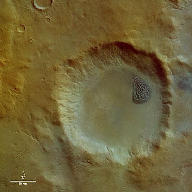 Das Bild zeigt einen Krater im nordwestlichen Randbereich des Argyre Planitia Einschlagbeckens auf dem Mars. Auf dem Boden des Kraters befindet sich ein Dünenfeld, welches aus dunklem, wahrscheinlich basaltischem (d.h. von Vulkanausbrüchen stammenden) Sand besteht. Das Kraterzentrum liegt ungefähr bei 303,2 Grad östlicher Länge und 43,9 Grad südlicher Breite. Der Krater besitzt einen Durchmesser von ungefähr 45 Kilometer und ist bis zu zwei Kilometer tief. Das Bild wurde von der hochauflösenden Stereokamera HRSC (High Resolution Stereo Camera) an Bord von Mars Express aufgenommen und vom Institut für Planetenforschung des Deutschen Zentrums für Luft- und Raumfahrt (DLR) und dem Institut für Geologische Wissenschaften der Freien Universität Berlin prozessiert. Mars Express ist eine Mission der Europäischen Weltraumorganisation ESA.