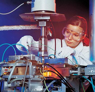 Das Bild zeigt eine thermomechanische Ermüdungsvorrichtung und dient zur Simulation von Betriebsbedingungen für Turbinenschaufelwerkstoffe im Labor.