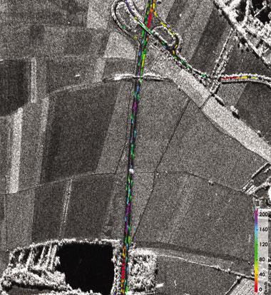 Das Bild zeigt, wie die ermittelte Geschwindigkeitsverteilung der Fahrzeuge auf der Autobahn A650 zur Visualisierung farblich kodiert werden kann. Derartige "Geschwindigkeitsbilder" liefern u.a. eine neue Qualität für die Analyse von Unfallschwerpunkten. Der große Vorteil der Verkehrsbeobachtung vom Weltraum aus ist die flächenmäßige Abbildung und die Möglichkeit der weltweiten Datenaquisition. Ein Radarsatellit bietet gegenüber einem optischen System den weiteren entscheidenden Vorteil, dass die Beobachtung völlig unabhängig vom Licht und dem Wetter ist. Der Start des ersten deutschen Fernerkundungssatelliten TerraSAR-X ist für Ende Oktober 2006 geplant.
