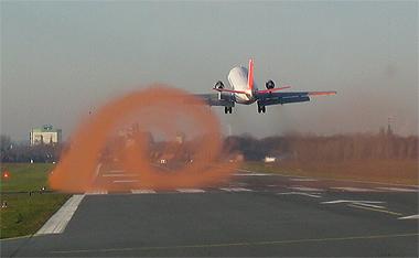 Visualisierung einer Wirbelschleppe des ATTAS am Forschungsflughafen. Wirbelschleppen sind Luftverwirbelungen, die durch die Tragflächen erzeug werden, insbesondere bei Langsamflug während Start und Landung.