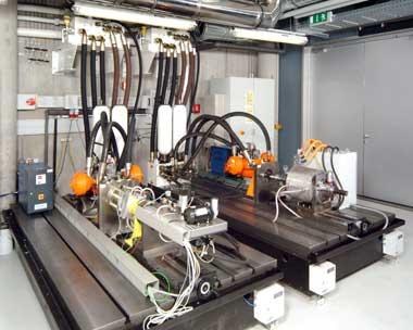 Gasfederprüfstand (vorne) und Lineargeneratorprüfstand (hinten). Die Ingenieure des DLR-Instituts für Fahrzeugkonzepte in Stuttgart entwickeln einen neuen Motor, der mit unterschiedlichen Kraftstoffen betrieben werden kann, diese optimal verbrennt und in elektrische Energie wandelt. Im DLR-Institut bestehen ideale Möglichkeiten zur Erprobung dieses neuen Antriebs. Auf den Testständen können die Komponenten Verbrennung, Lineargenerator und Gasfeder mit der zugehörigen Steuerungselektronik einzeln verifiziert und dann zu einem Gesamtsystem zusammengefügt und getestet werden.