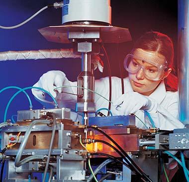 Das Bild zeigt eine thermomechanische Ermüdungsvorrichtung und dient zur Simulation von Betriebsbedingungen für Turbinenschaufelwerkstoffe im Labor.