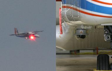 Links: Das DLR-Forschungsflugzeug Do 228 während der Datenübertragung. Die mit den Daten modulierte infrarote Laserstrahlung hat eine Wellenlänge von 1550 Nanometern und ist unsichtbar. Auf diesem Foto ist auch der sichtbare Laser zugeschaltet, der nur für Kalibrierzwecke genutzt wird. Das Strahlausrichtungssystem (Trackingsystem) sorgt für die optimale Ausrichtung des Lasersystems auf die Empfangsstation. Rechts: Das optische Terminal ist auf der Unterseite des Flugzeugs montiert.
