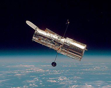 Das Hubble-Weltraumteleskop (Hubble Space Telescope) aufgenommen während der zweiten Servicemission 1997. Hubble schwebt in 569 Kilometern Höhe über der Erde. Von dort aus fotografiert Hubble unter anderem die Planeten unseres Sonnensystems unbeeinträchtigt durch Wolken oder störender Lichtverschmutzung der irdischen Atmosphäre.
